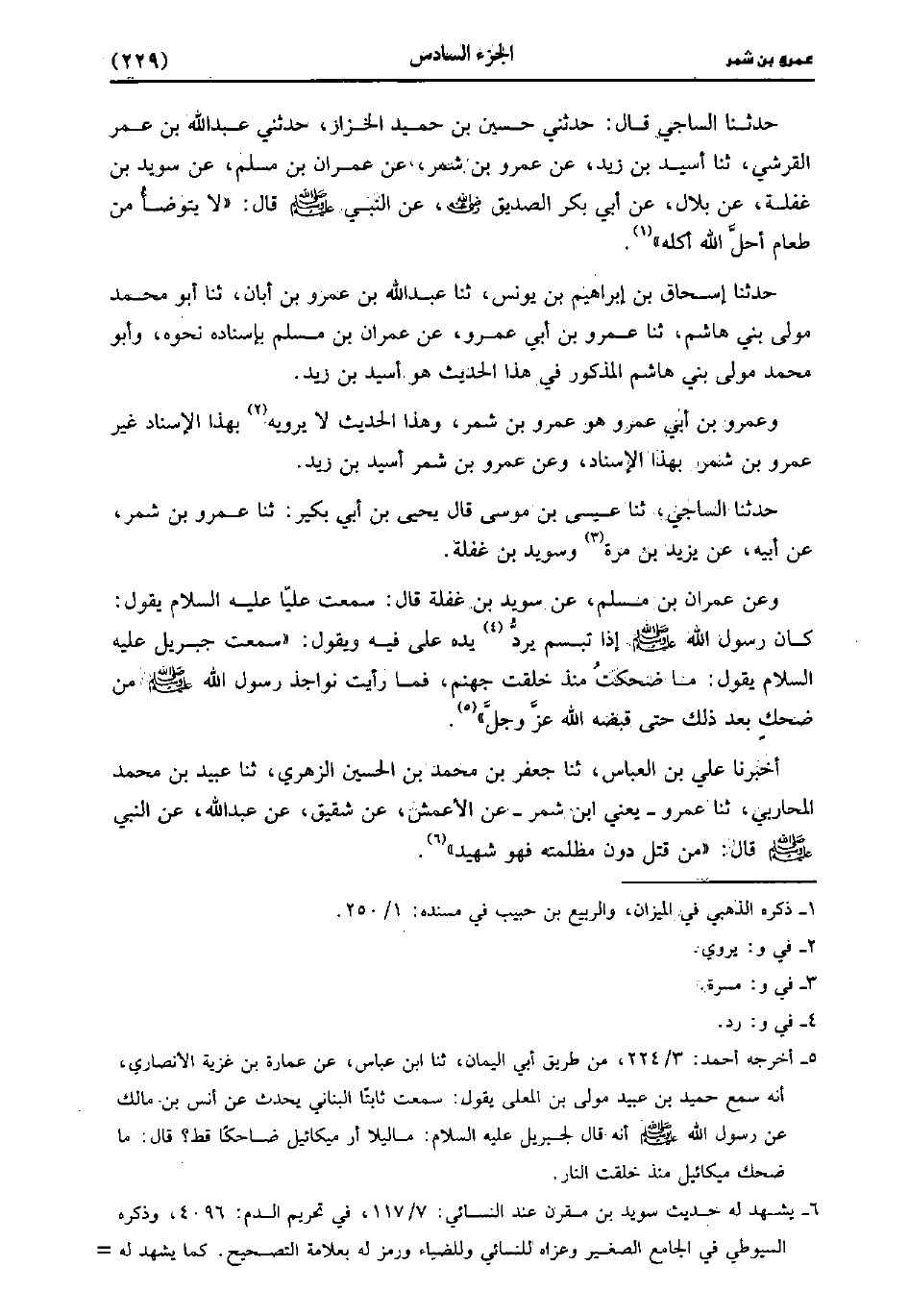 ، حَدَّثَنا السَّاجِيُّ، قَال: حَدَّثني حُسَيْنُ بْنُ حُمَيْدٍ الْخَزَّازُ، حَدَّثني عَبد الله بن عُمَر القرشي، حَدَّثَنا أُسَيْدُ بْنُ زَيْدٍ عَنْ عَمْرو بْنِ شِمْرٍ عَنْ عِمْرَانَ بْنِ مُسْلِمٍ عَنْ سُوَيْدِ بْنِ غَفَلَةَ عَنْ بِلالٍ، عَن أَبِي بَكْرٍ الصديق رضي الله عَنْهُ عَن النَّبِيّ صَلَّى اللَّه عَلَيه وسَلَّم قَال: لا يُتَوَضَّأُ مِنْ طَعَامٍ أَحَلَّ اللَّهُ أَكْلَهُ.