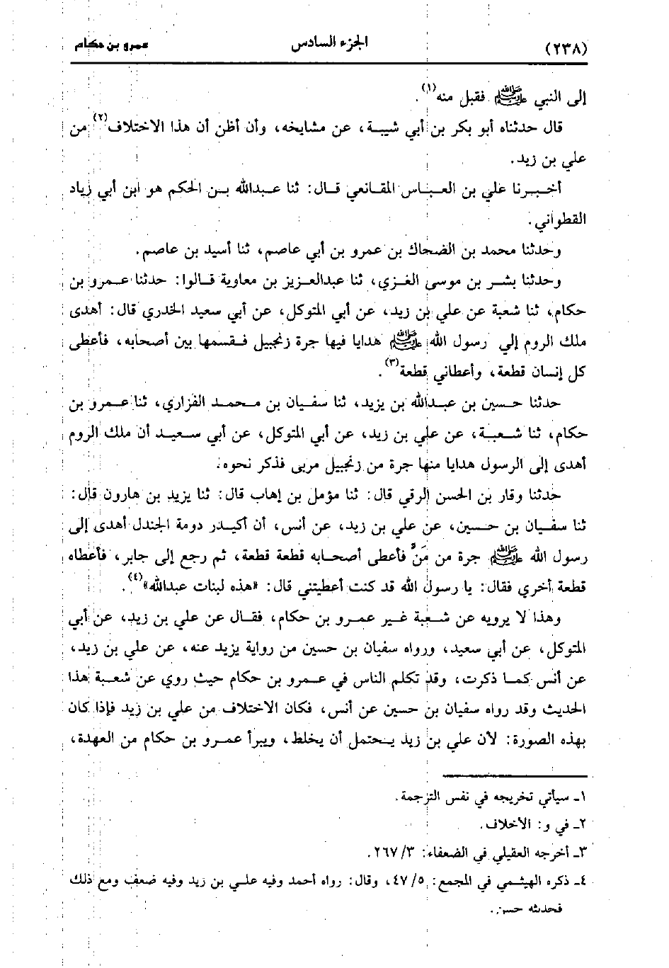حَدَّثَنَا حُسَيْنُ بْنُ عَبد الله بن يزيد، حَدَّثَنا سُفْيَانُ بْنُ مُحَمد الْفَزَارِيُّ، حَدَّثَنا عَمْرو بن حكام، حَدَّثَنا شُعْبَة عَنْ عَلِيِّ بْنِ زَيْدٍ، عَن أَبِي الْمُتَوَكِّلِ، عَن أَبِي سَعِيد أَنَّ مَلِكَ الرُّومِ أَهْدَى إِلَى الرَّسُولِ هَدَايَا مِنْهَا جَرَّةٌ مِنْ زَنْجَبِيلٍ مُرَبَّى ... ، فَذَكَرَ نَحْوَهُ.