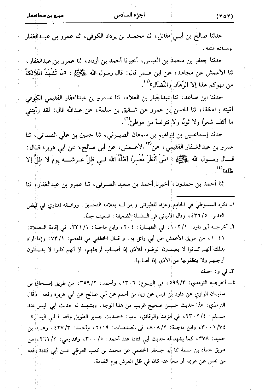حَدَّثَنَا ابْنُ صاعد، حَدَّثَنا عَبد الْجَبَّارِ بْنُ الْعَلاءِ، حَدَّثَنا عَمْرو بْن عَبد الغفار الفقيمي الكوفي لقيته بمكة، حَدَّثَنا الْحَسَنُ بْنُ عَمْرو عَنْ شَقِيقِ بن سلمة، عن عبدا لله قَالَ لَقَدْ رَأَيْتُنِي مَا أَكُفُّ شَعَرًا، ولاَ ثَوْبًا، ولاَ نَتَوَضَّأُ من موطىء.