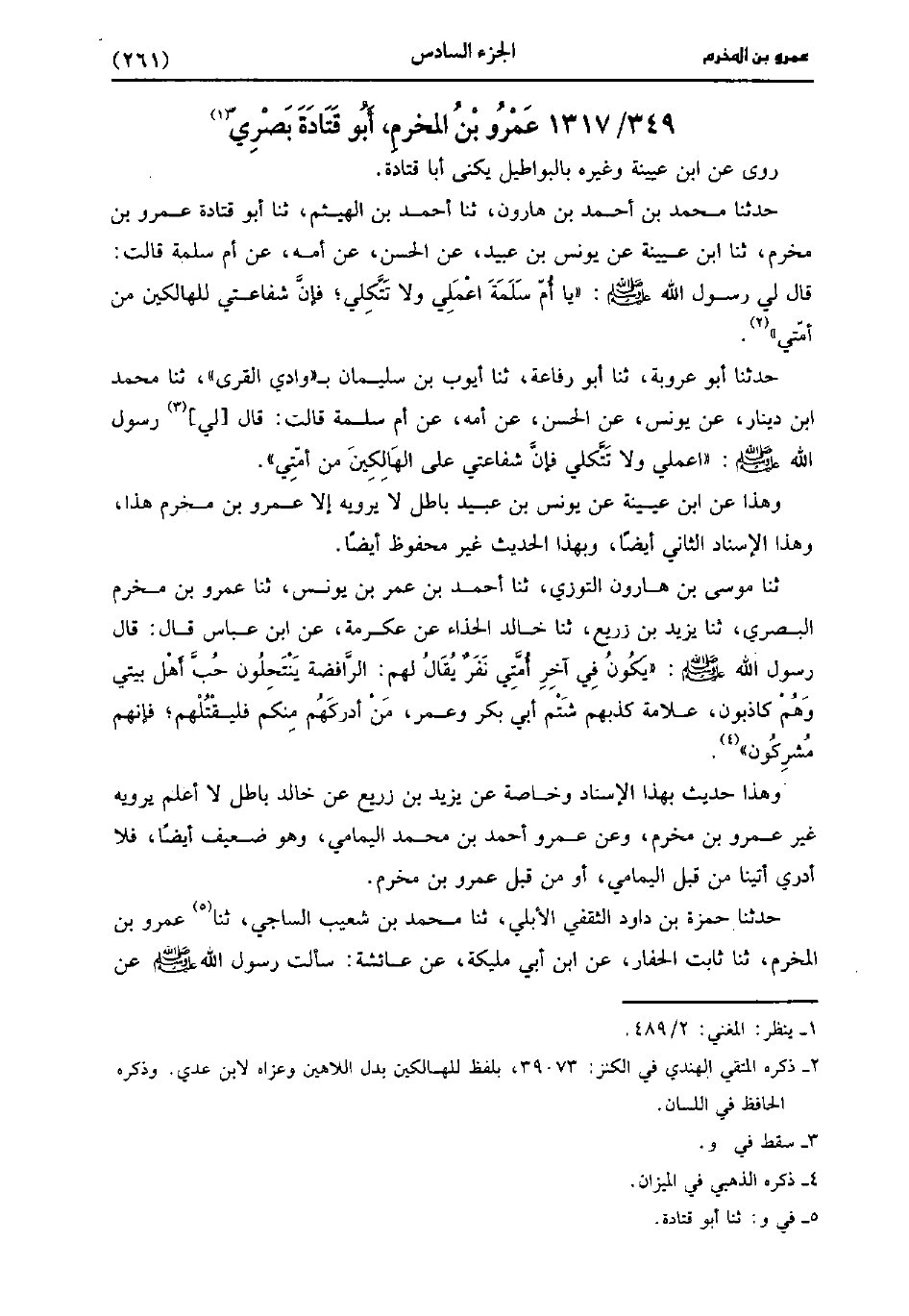 حَدَّثَنَا مُحَمد بْنُ أَحْمَدَ بْنِ هَارُونَ، حَدَّثَنا أَحْمَدُ بْنُ الْهَيْثَمِ، حَدَّثَنا أَبُو قَتَادَةَ عَمْرو بْنُ مَخْرَمٍ، حَدَّثَنا ابْنُ عُيَينة عَنْ يُونُس بْنِ عُبَيد عَنِ الْحَسَنِ، عَن أُمِّهِ عَنْ أُمِّ سَلَمَةَ قَالَتْ قَال لِي رَسُولُ اللَّهِ صَلَّى اللَّهُ عَلَيْهِ وَسَلَّمَ يَا أُمَّ سَلَمَةَ اعْمَلِي، ولاَ تَتَّكِلِي فَإِنَّ شَفَاعَتِي لِلْهَالِكِينَ مِنْ أُمَّتِي.