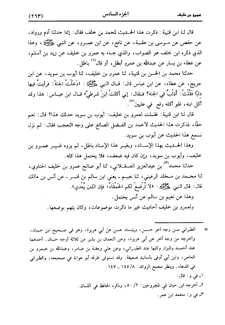وَهَذَا عَنْ نُعَيْمِ بْنِ سَالِمٍ، عَن أَنَس يَحْتَمِلُ وَلِعَمْرِو بْنِ خُلَيْفٍ أَحَادِيثُ غَيْرُ مَا ذَكَرْتُ مَوْضُوعَاتٌ وكان يتهم بوضعها