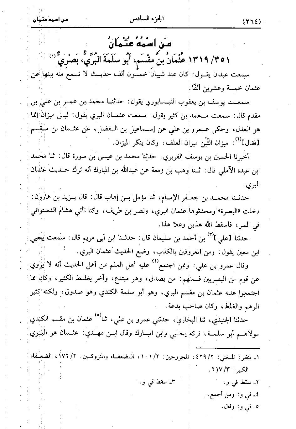 حَدَّثَنَا الجنيدي، حَدَّثَنا البُخارِيّ، حَدَّثني عَمْرو بن علي، حَدَّثَنا عُثْمَان بْن مقسم الكندي مولاهم أَبُو سلمة تركه يَحْيى، وابن المبارك وَقَالَ ابن مهدي عُثْمَان هو البري