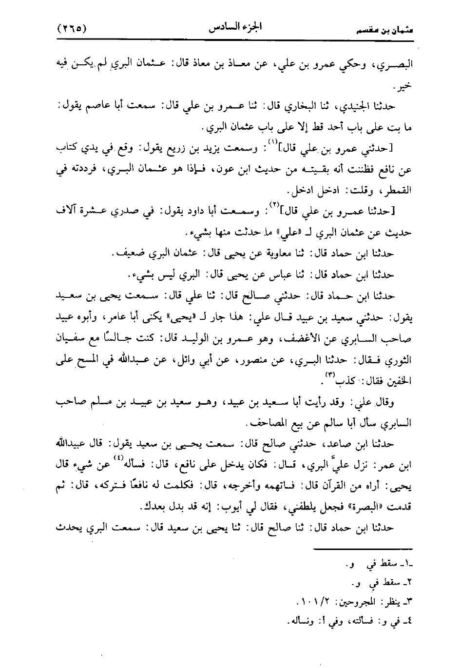 حَدَّثَنَا ابن حماد، قَال: حَدَّثَنا عباس، عَن يَحْيى، قَالَ البري ليس بشَيْءٍ، حَدَّثَنا ابْن حَمَّاد، قَال: حَدَّثني صالح، قَال: حَدَّثَنا علي، قَالَ: سَمِعْتُ يَحْيى بْنَ سَعِيد يَقُولُ، حَدَّثني سَعِيد بْن عُبَيد قَالَ علي هَذَا جار ليحيى، يُكَنَّى أبا عامر وأبوه عُبَيد صاحب السابري عَن الأغضف، وَهو عَمْرو بْن الوليد قَال: كنتُ جالسا مع سُفْيَان الثَّوْريّ فَقَالَ، حَدَّثَنا البري عَن منصور، عَن أبي وائل عَن عَبد اللَّهِ فِي المسح عَلَى الخفين فَقَالَ كذب.