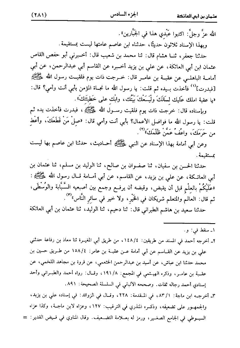 حَدَّثَنَا الْحَسَنُ بْنُ سُفْيَانَ، حَدَّثَنا صفوان بن صالح، حَدَّثَنا الوليد بن مسلم، حَدَّثَنا عُثْمَانُ بْنُ أَبِي الْعَاتِكَةِ عَنْ عَلِيِّ بْنِ يَزِيدَ، عَنِ الْقَاسِمِ، عَن أَبِي أُمَامَةَ قَال رَسُول اللهِ صَلَّى اللَّهُ عَلَيهِ وَسلَّمَ عَلَيْكُمْ بِالْعِلْمِ قَبْلَ أَنْ يُقْبَضَ العالم والمتعلم كهذه من هذه وَجَمَعَ بَيْنَ أُصْبُعَيْهِ السَّبَّابَةِ وَالْوُسْطَى شَرِيكان فِي الْخَيْرِ، ولاَ خَيْرَ فِي سَائِرِ النَّاسِ.