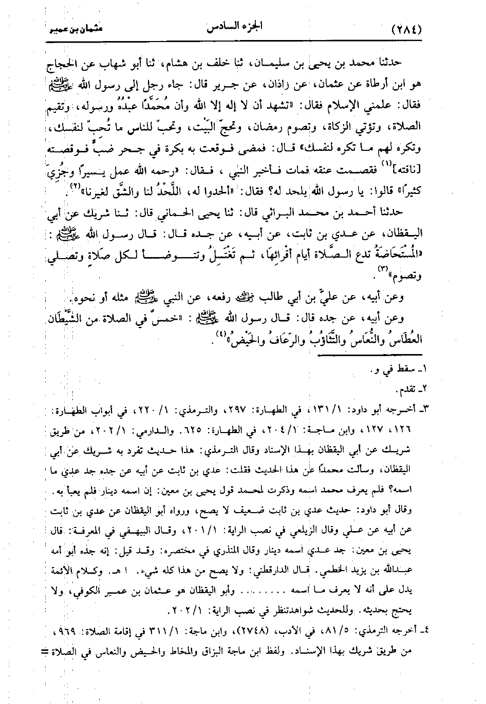 حَدَّثَنَا أَحْمَدُ بْنُ مُحَمد الْبَرَاثِيُّ، قَال: حَدَّثَنا يَحْيى الحماني، قَال: حَدَّثَنا شَرِيك، عَن أَبِي الْيَقْظَانِ عَنْ عَدِيِّ بْنِ ثَابِتٍ، عَنْ أَبِيهِ، عَن جَدِّهِ، قَال: قَال رَسُولُ اللَّهِ صَلَّى اللَّهُ عَلَيْهِ وَسَلَّمَ الْمُسْتَحَاضَةُ تَدَعُ الصَّلاةَ أَيَّامَ أَقْرَائِهَا ثُمَّ تَغْتَسِلُ وَتَتَوَضَّأُ لِكُلِّ صَلاةٍ وَتُصَلِّي وَتَصُومُ.