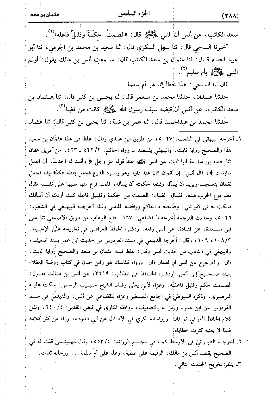 سَعْدٍ الْكَاتِبِ، عَن أَنَس أَنّ النَّبِيُّ صَلَّى اللَّهُ عَلَيه وسَلَّم قَال: الصَّمْتُ حُكْمٌ وَقَلِيلٌ فَاعِلُهُ.