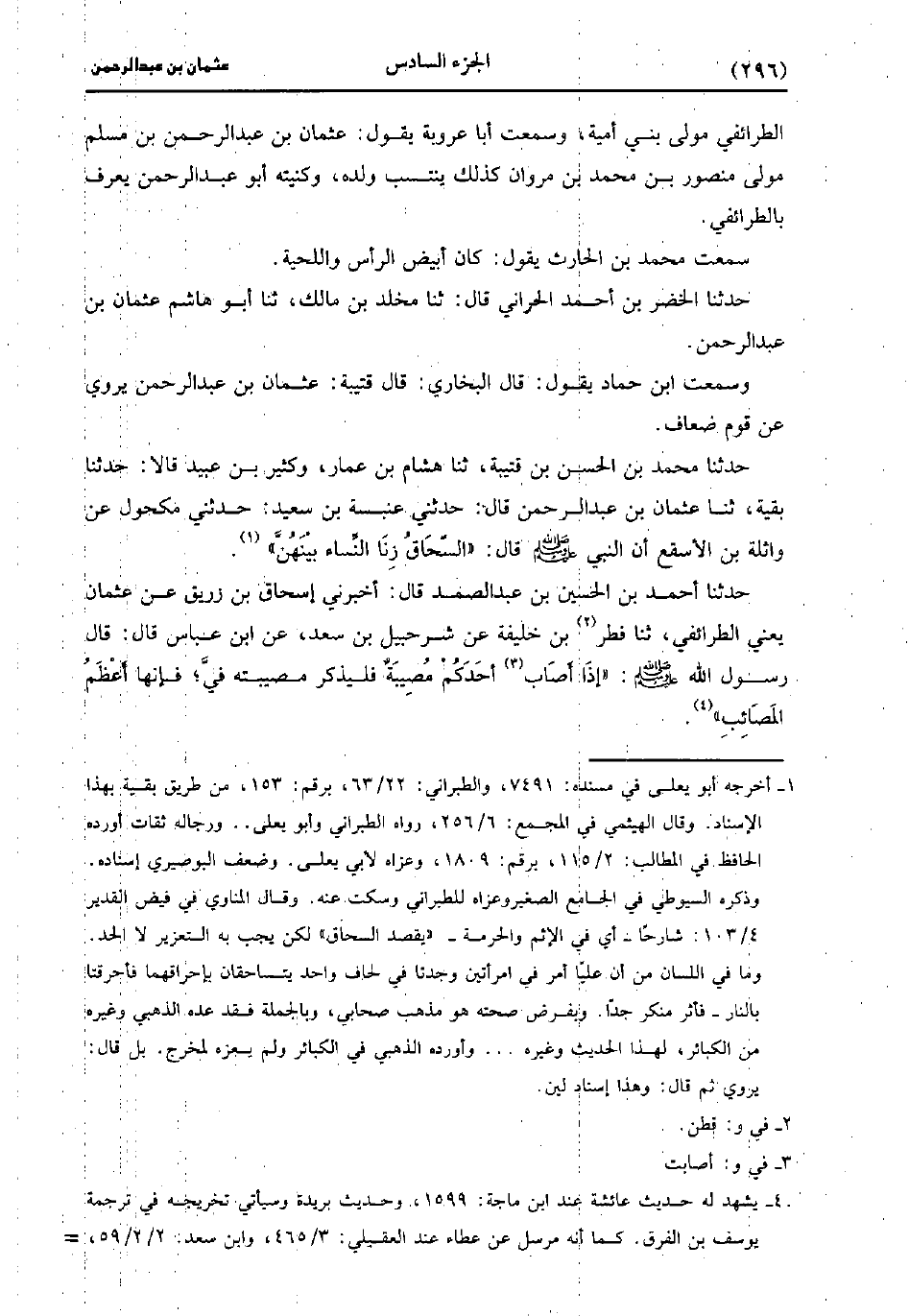حَدَّثَنَا مُحَمد بْنُ الْحَسَنِ بْنِ قُتَيْبَةَ، حَدَّثَنا هِشَامُ بْنُ عَمَّارٍ وَكَثِيرُ بْنُ عُبَيد، قالا: حَدَّثَنا بقية، حَدَّثَنا عُثْمَانُ بْنُ عَبد الرَّحْمَنِ، قَال: حَدَّثني عَنْبَسَةُ بْنُ سَعِيد، حَدَّثني مَكْحُولٌ عَنْ وَاثِلَةَ بْنِ الأَسْقَعِ أَنَّ النَّبِيَّ صَلَّى اللَّهُ عَلَيه وسَلَّم قَال: السِّحَاقُ زِنَا النِّسَاءِ بَيْنَهُنَّ.