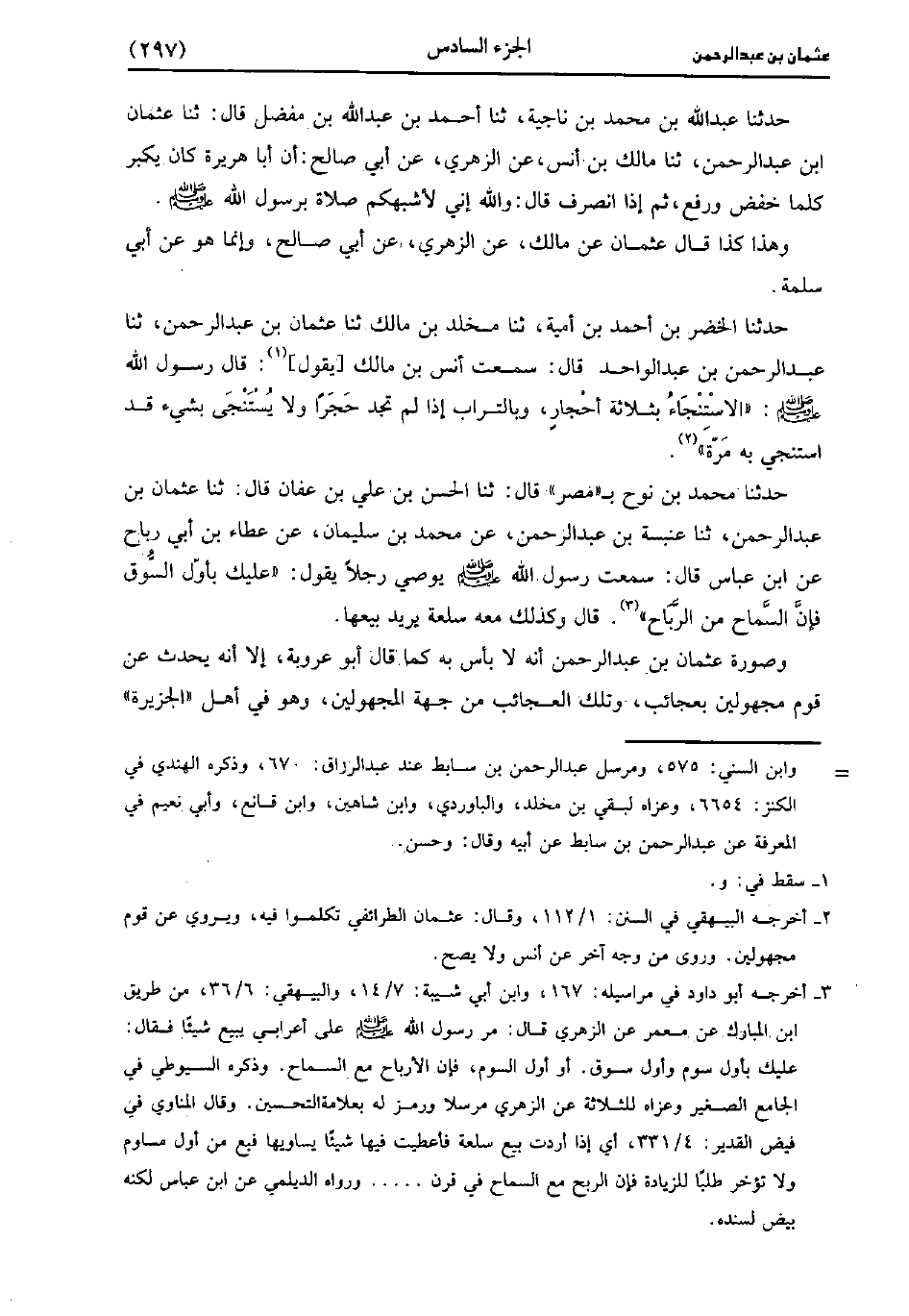 حَدَّثَنَا الْخِضْرُ بْنُ أحمد بن أمية، حَدَّثَنا مخلد بن مالك، حَدَّثَنا عُثْمَانُ بْنُ عَبد الرَّحْمَنِ، حَدَّثَنا عَبد الرَّحْمَنِ بْنُ عَبد الْوَاحِدِ، قَالَ: سَمِعْتُ أَنَسَ بْنَ مَالِكٍ يَقُولُ: قَال رَسُول اللهِ صَلَّى اللَّهِ عَلَيهِ وَسلَّمَ الاسْتِنْجَاءُ بِثَلاثَةِ أَحْجَارٍ وَبِالتُّرَابِ إِذَا لَمْ تَجِدْ حَجَرًا، ولاَ يُسْتَنْجَى بشَيْءٍ قَدِ اسْتُنْجِيَ بِهِ مَرَّةً.