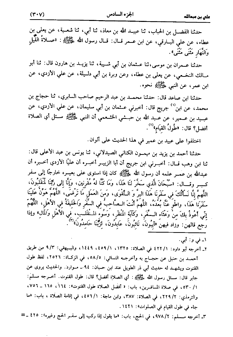 حَدَّثَنَا أَحْمَدُ بْنُ يَزِيدَ بْنِ مَيْمُونٍ الكناني الصيدلاني، حَدَّثَنا يُونُس بْنُ عَبد الأَعْلَى، قَال: حَدَّثَنا ابن وهب قال أخبرني بن جُرَيج أَنَّ أَبَا الزُّبَيْرِ أَخْبَرَهُ أَنَّ عَلِيًّا الأَزْدِيَّ أَخْبَرَهُ أَنَّ عَبد اللَّهِ بْنَ عُمَر عَلَّمَهُ إِنَّ رَسُولَ اللَّهِ صَلَّى اللَّهُ عَلَيْهِ وَسَلَّمَ كَانَ إِذَا اسْتَوَى عَلَى بَعِيرِهِ خَارِجًا إِلَى سَفَرٍ كَبَّرَ وَقَالَ سُبْحَانَ الَّذِي سَخَّرَ لَنَا هَذَا وَمَا كُنَّا لَهُ مُقْرِنِينَ وَإِنَّا إِلَى رَبِّنَا لَمُنْقَلِبُونَ اللَّهُمَّ إِنَّا نَسْأَلُكَ فِي سَفَرِنَا هَذَا الْبِرَّ وَالتُّقَى وَمِنَ الْعَمَلِ مَا تَرْضَى اللَّهُمَّ هَوِّنْ عَلَيْنَا سَفَرَنَا هَذَا وَاطْوِ عَنَّا بُعْدَهُ اللَّهُمَّ أَنْتَ الصَّاحِبُ فِي السَّفَرِ وَالْخَلِيفَةُ فِي الأَهْلِ اللَّهُمَّ إِنِّي أَعُوذُ بِكَ مِنْ وَعْثَاءِ السَّفَرِ وَكَآبَةِ الْمَنْظَرِ وَسُوءِ الْمُنْقَلَبِ فِي الأَهْلِ وَالْمَالِ، وَإذا رَجَعَ قَالَهُنَّ وَزَادَ فِيهِنَّ آيِبُونَ تَائِبُونَ عَابِدُونَ لِرَبِّنَا حَامِدُونَ.