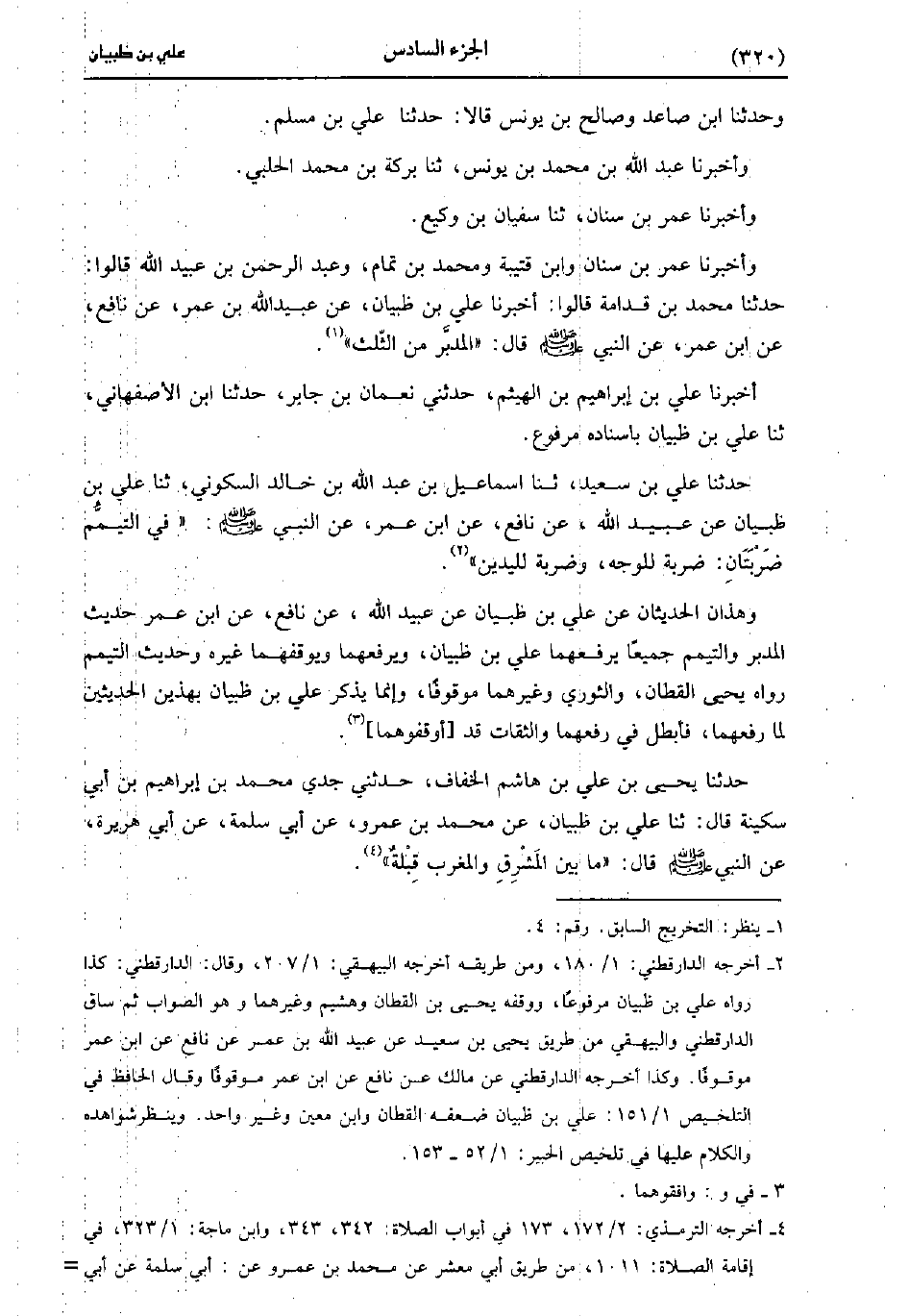 وَهَذَانِ الْحَدِيثَانِ عَنْ عَلِيِّ بْنِ ظَبْيَانَ عَنْ عُبَيد اللَّهِ عَنْ نافع، عنِ ابْنِ عُمَر حديث الْمُدْبِرِ وَالتَّيَمُّمِ جَمِيعًا يُرْفَعُهُمَا عَلِيُّ بْنُ ظِبْيَانَ وَيَرْفَعُهُمَا وَيُوقِفُهُمَا غَيْرُهُ وَحَدِيثُ التَّيَمُّمِ رَوَاهُ يَحْيى الْقَطَّانُ وَالثَّوْرِيُّ وَغَيْرُهُمَا مَوْقُوفًا، وإِنَّما يُذَكِّرُ عَلِيُّ بْنُ ظِبْيَانَ بِهَذَيْنِ الْحَدِيثَيْنِ لِمَا رَفَعَهُمَا فَأَبْطَلَ فِي رَفْعِهِمَا وَالثِّقَاتُ قَدْ أَوْقَفُوهُمَا.