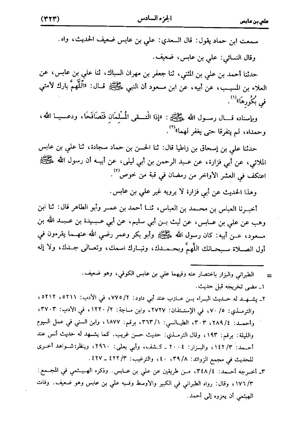 حَدَّثَنَا أَحْمَدُ بْنُ عَلِيِّ بْنِ الْمُثَنَّى، حَدَّثَنا جعفر بن مهران السباك، حَدَّثَنا عَلِيُّ بْنُ عَابِسٍ، عَن العَلاَء بْنِ المُسَيَّب، عَنْ أَبِيهِ، عنِ ابْنِ مَسْعُودٍ أَنَّ النَّبِيَّ صَلَّى اللَّهُ عَلَيه وسَلَّم قَال: اللَّهُمَّ بَارِكْ لأُمَّتِي فِي بُكُورِهَا.