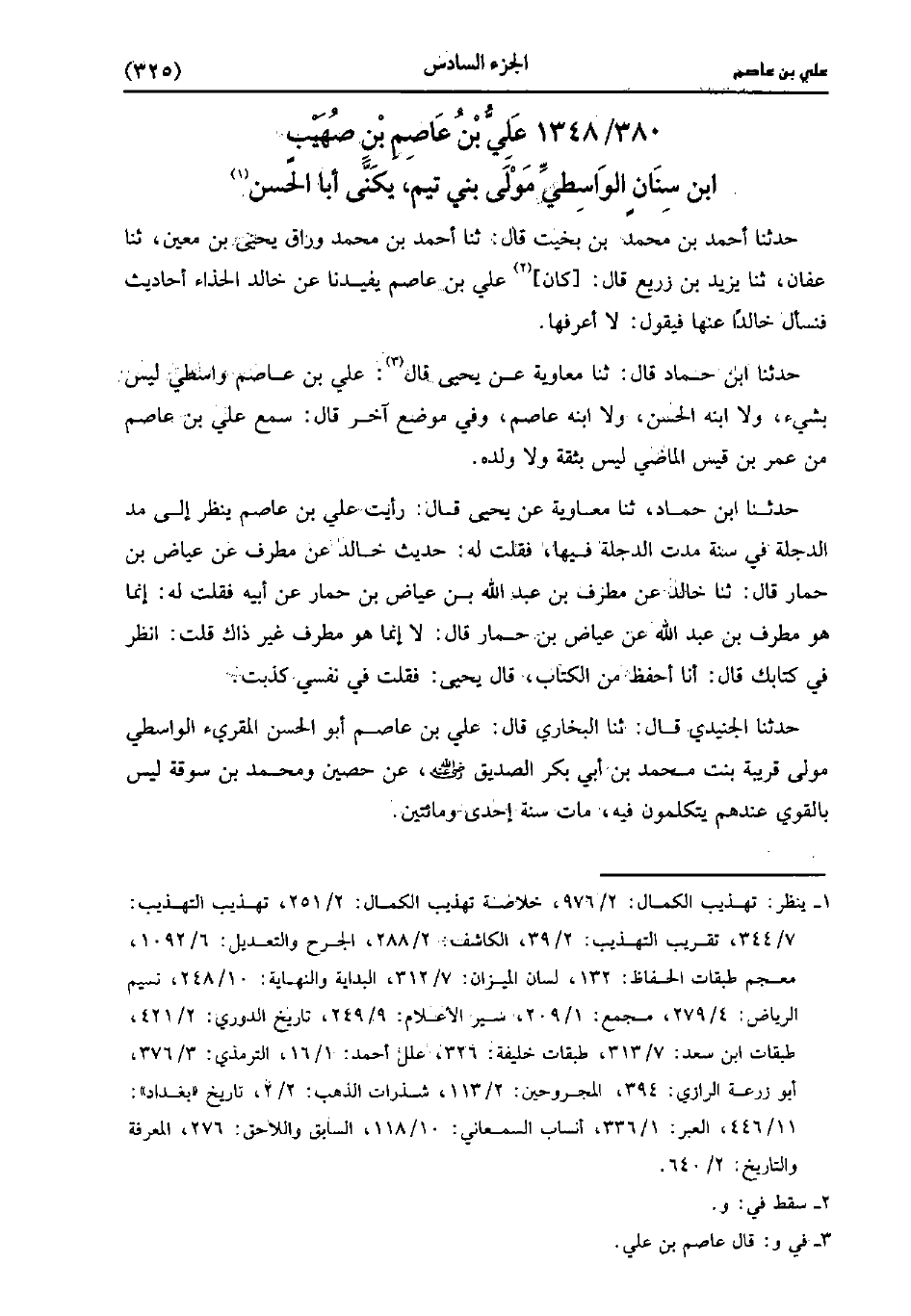 1348- علي بْن عاصم بْن صهيب بْن سنان الواسطي مولى بني تيم، يُكَنَّى أبا الْحَسَن.