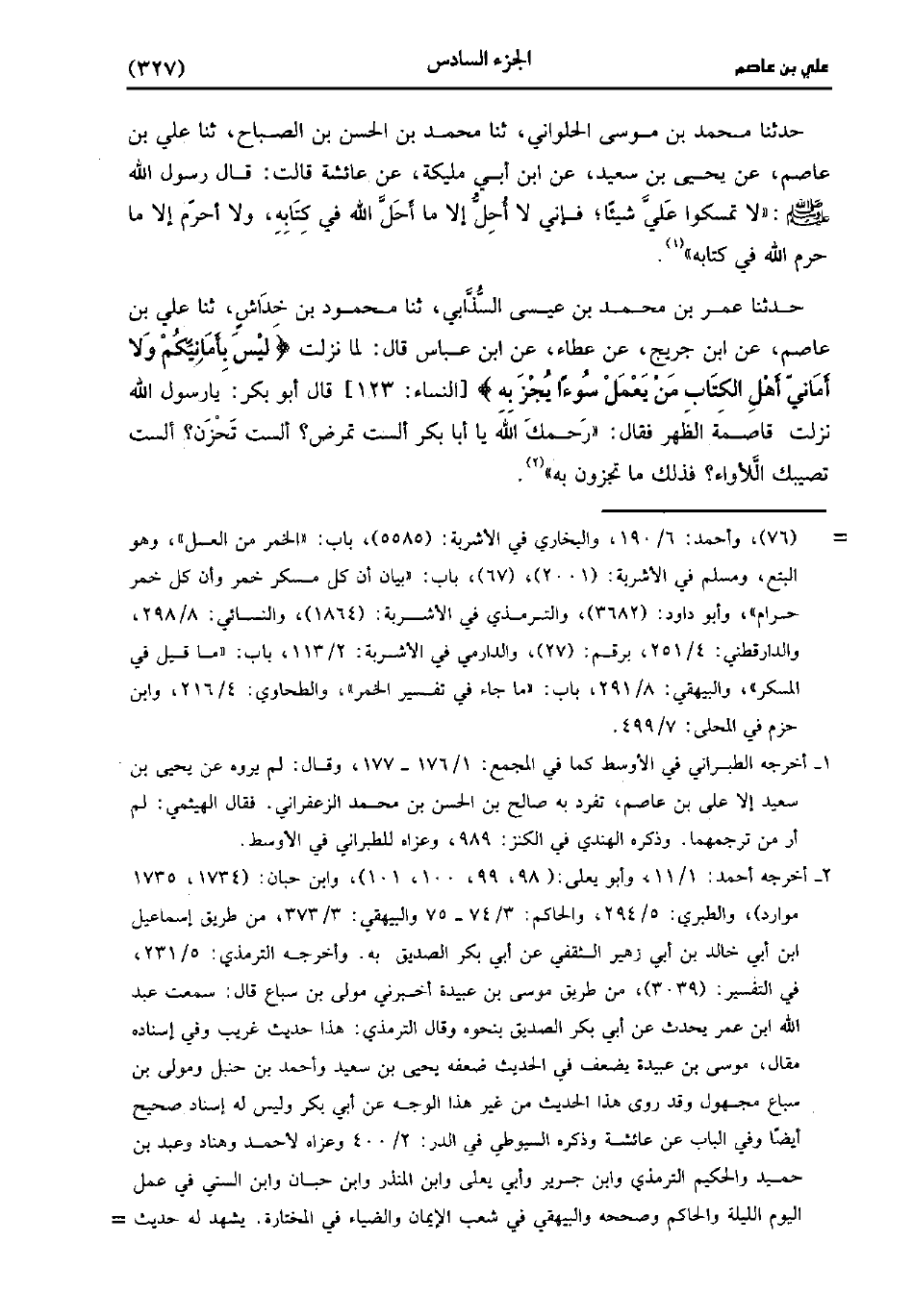 حَدَّثَنَا عُمَر بْنُ مُحَمد بْنِ عِيسَى السَّذَابِيُّ، حَدَّثَنا محمود بن خداش، حَدَّثَنا علي بن عاصم، عنِ ابْنِ جُرَيج، عَن عَطَاءٍ، عنِ ابْنِ عَبَّاسٍ، قَال: لَمَّا نَزَلت لَيْسَ بِأَمَانِيِّكُمْ، ولاَ أَمَانِيِّ أَهْلِ الْكِتَابِ مَنْ يَعْمَلْ سُوءًا يُجْزَ به قَالَ أَبُو بَكْرٍ يَا رَسُولَ اللهِ نَزَلَتْ قَاصِمَةُ الظَّهْرِ فَقَالَ رَحِمَكَ اللَّهُ يَا أَبَا بَكْرٍ أَلَسْتَ تَمْرَضُ أَلَسْتَ تَحْزَنُ أَلَسْتَ تُصِيبُكَ اللأْوَاءُ فَذَلِكَ مَا تُجْزَوْنَ به