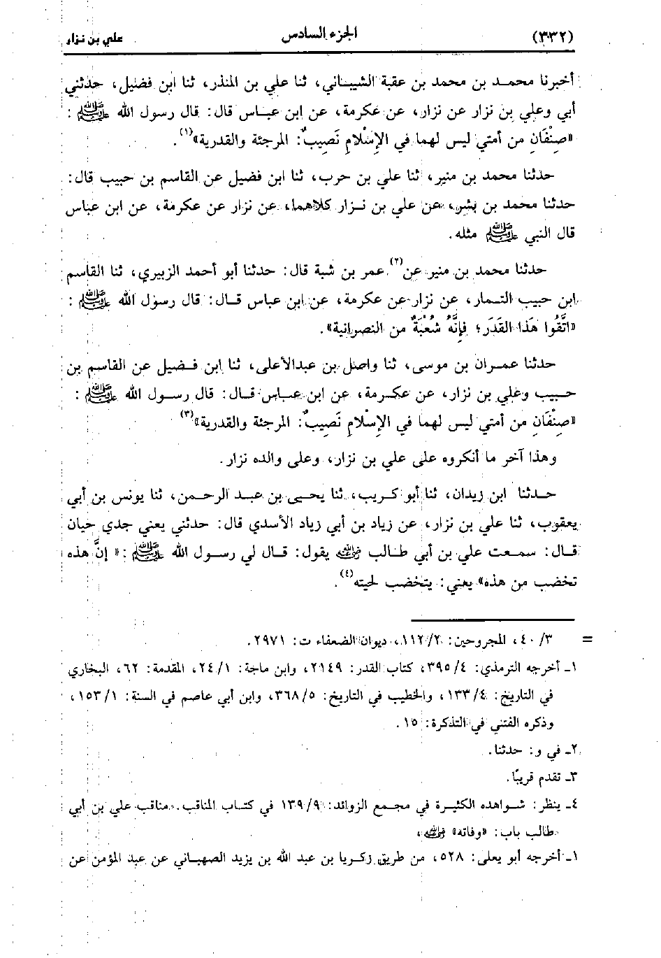 أَخْبَرنا مُحَمد بْنُ مُحَمد بْنِ عقبة الشيباني، حَدَّثَنا علي بن المنذر، حَدَّثَنا ابْنُ فُضَيْلٍ، حَدَّثني أَبِي، وَعلي بْنُ نِزَارٍ عَنْ نِزَارٍ، عَنْ عِكرمَة، عنِ ابْنِ عَبَّاسٍ، قَال: قَال رَسُولُ اللَّهِ صَلَّى اللَّهُ عَلَيْهِ وَسَلَّمَ صِنْفَانِ مِنْ أُمَّتِي لَيْسَ لَهُمَا فِي الإِسْلامِ نَصِيبٌ الْمُرْجِئَةُ وَالْقَدَرِيَّةُ.