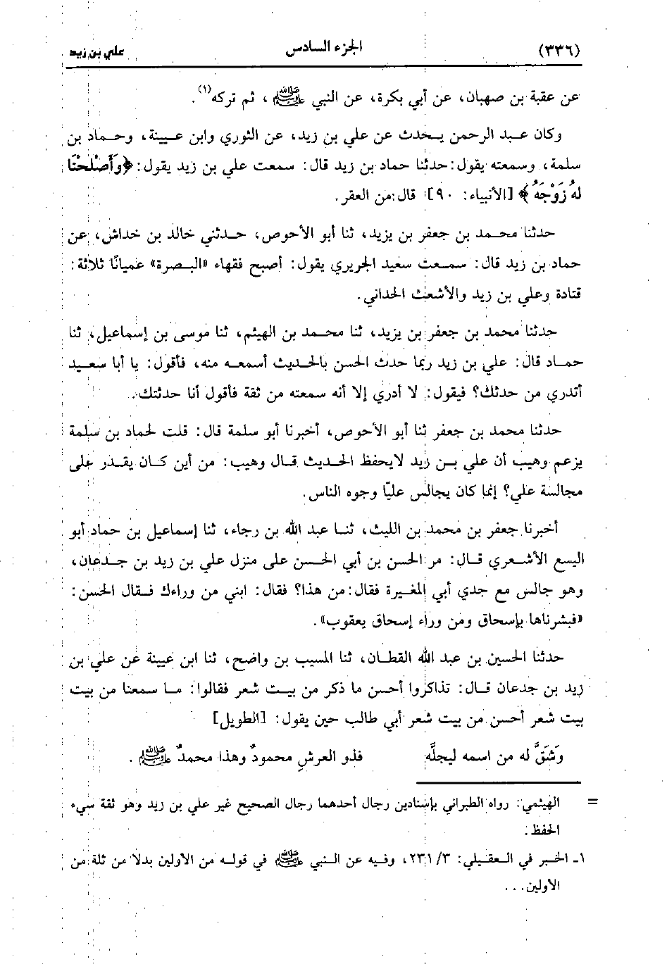 حَدَّثَنَا مُحَمد بْنُ جَعْفَرِ بْنِ يَزِيدَ، حَدَّثَنا أَبُو الأَحْوَصِ، حَدَّثني خَالِدُ بْنُ خَدَّاشٍ عَن حَمَّاد بْن زيد، قَالَ: سَمِعْتُ سَعِيد الْجُرَيْرِيَّ يَقُولُ أَصْبَحَ فُقَهَاءُ الْبَصْرَةِ عُمْيَانًا ثَلاثَةً قَتَادَةُ، وَعلي بْنُ زَيْدٍ وَالأَشْعَثُ الْحَدَّانِيُّ.