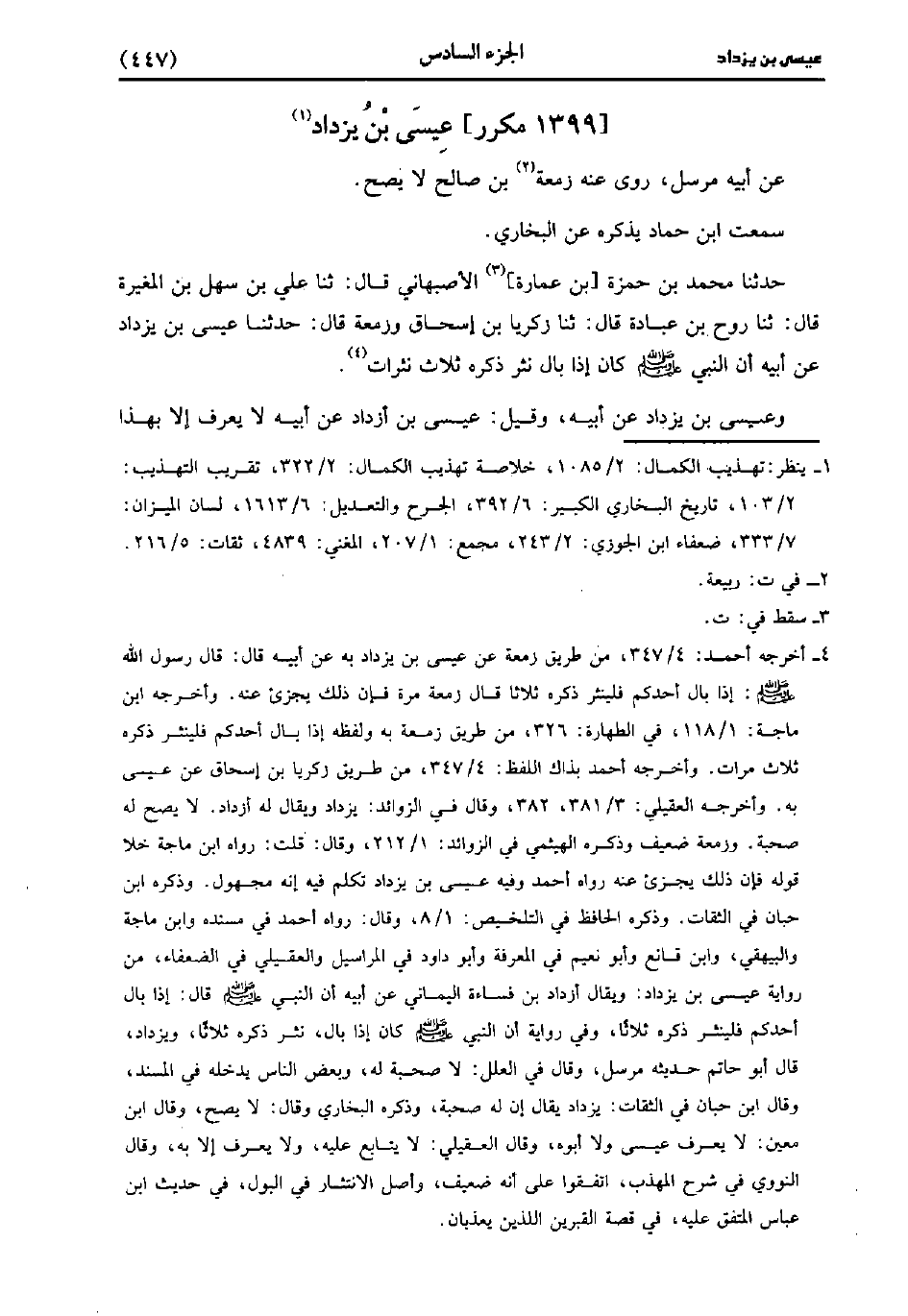 سمعتُ ابن حماد يذكره عَن البُخارِيّ، حَدَّثَنا مُحَمد بْنُ حَمْزَةَ بْنِ عِمَارَةَ الأصبهاني، قَال: حَدَّثَنا عَلِيُّ بْنُ سَهْلِ بْنِ الْمُغِيرَةِ، قَال: حَدَّثَنا روح بن عبادة، قَال: حَدَّثَنا زَكَرِيَّا بْنُ إِسْحَاقَ وَزَمْعَةُ، قَالا: حَدَّثَنا عِيسَى بْنُ يَزْدَادَ، عَنْ أَبِيهِ أَنّ النَّبِيَّ صَلَّى اللَّهُ عَلَيهِ وَسلَّمَ كَانَ إِذَا بَالَ نَثَرَ ذَكَرَهُ ثَلاثَ نَثْرَاتٍ.