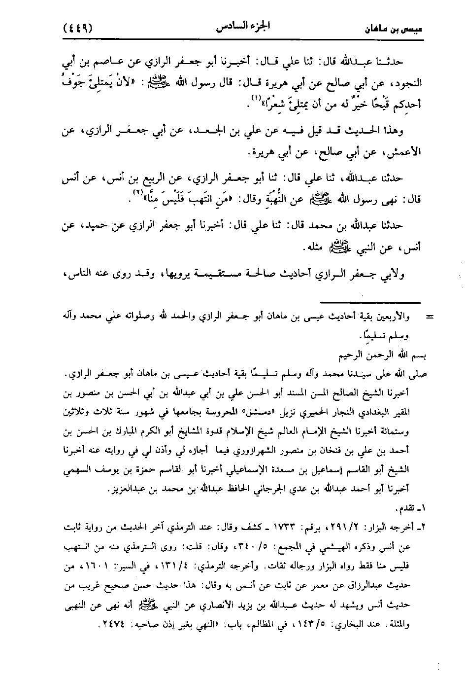 حَدَّثَنَا عَبد اللَّه بن مُحَمد، قَال: حَدَّثَنا عَلِيٌّ، قَال: أَخْبَرنا أَبُو جَعْفَرٍ الرَّازِيُّ عَنْ حُمَيْدٍ، عَن أَنَس عَنِ النَّبِيِّ صَلَّى اللَّهُ عَلَيهِ وَسلَّمَ مثله.