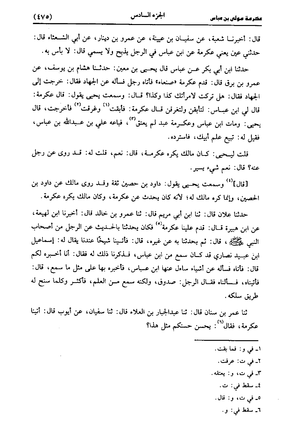 حَدَّثَنَا ابن أبي بكر، عَن عباس قَالَ يَحْيى بْن مَعِين، حَدَّثَنا هشام بْن يوسف عَنْ عَمْرو بْن برق قَالَ قدم عِكرمَة صنعاء فأتاه رجل فسأله عَن الجهاد فَقَالَ خرجت إِلَى الجهاد فَقَالَ هل تركت لامرأتك كذا وكذا قَالَ وسمعتُ يَحْيى يَقُولُ: قَالَ عِكرمَة قَال لي بن عباس لتأبقن ولتغرقن قَالَ عِكرمَة فأبقت وغرقت فأخرجت قَالَ يَحْيى وما بن عباس وعكرمة عَبد لم يعتق فباعه علي بْن عَبد اللَّهِ بْن عباس فقيل لَهُ تبيع علم أبيك فاسترده، قلتُ ليحيى كَانَ مالك يكره عِكرمَة؟ قَال: نَعم قلت لَهُ قد روى عَن رجل عَنْهُ؟ قَال: نَعم شيء يسير.