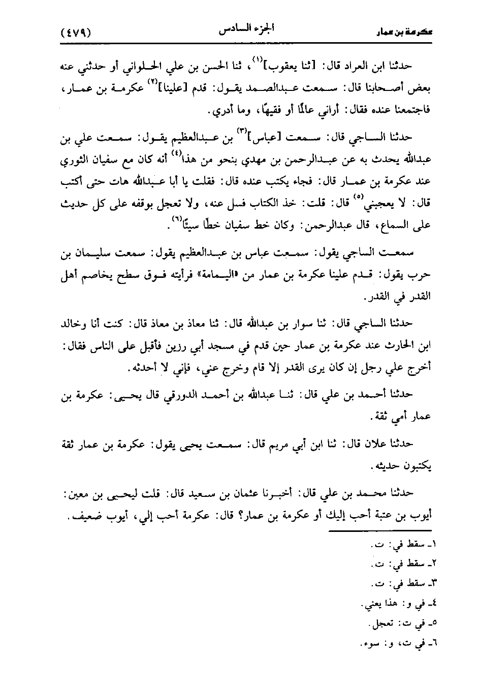 - حَدَّثَنَا الساجي، قَالَ: سَمِعْتُ عباس بْن عَبد الْعَظِيمِ يَقُولُ: سَمعتُ عَلِيَّ بْن عَبد اللَّهِ يحدث به عَنْ عَبد الرَّحْمَنِ بْنِ مَهْدِيٍّ بنحو من هَذَا أنه كَانَ مع سُفْيَان الثَّوْريّ عند عِكرمَة بْن عمار قَالَ فجاء يكتب عنده قَالَ فقلت يا أبا عَبد اللَّهِ هات حتى أكتب؟ قَال: لاَ يعجبني، قالَ: قُلتُ خذ الكتاب فسل عَنْهُ، ولاَ تعجل بوقفه عَلَى كل حديث عَلَى السماع قَالَ عَبد الرَّحْمَنِ وكان خط سفيان خط سيء.