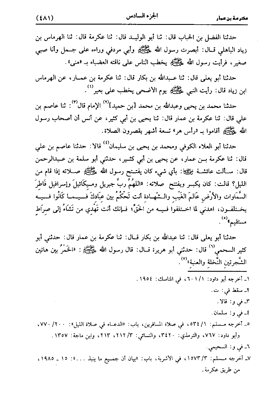 حَدَّثَنَا أَبُو الْعَلاءِ الْكُوفِيُّ، وَمُحمد بْنُ يَحْيى بْنِ سُلَيْمَانَ، قَالا: حَدَّثَنا عَاصِمُ بْنُ علي، قَال: حَدَّثَنا عِكرمَة بْنُ عَمَّارٍ، عَن يَحْيى بْنُ أَبِي كَثِيرٍ، حَدَّثني أَبُو سَلَمَةَ بْنِ عَبد الرَّحْمَنِ، قالَ: سَألتُ عَائِشَةَ رَضِيَ اللَّهُ عَنْهُا بِأَيِّ شَيْءٍ كَانَ يَفْتَتِحُ رَسُولِ اللَّهِ صَلَّى اللَّهُ عَلَيْهِ وَسَلَّمَ صَلاتَهُ إِذَا قَامَ مِنَ اللَّيْلِ قَالَتْ كَانَ يُكَبِّرُ وَيَفْتَتِحُ صَلاتَهُ اللَّهُمَّ رَبَّ جِبْرِيلَ وَمِيكَائِيلَ وَإِسْرَافِيلَ فَاطِرَ السَّمَاوَاتِ وَالأَرْضِ عَالِمَ الْغَيْبِ وَالشَّهَادَةِ أَنْتَ تَحْكُمُ بَيْنَ عِبَادِكَ فِيمَا كَانُوا فِيهِ يَخْتَلِفُونَ اهْدِنِي لِمَا اخْتَلَفُوا فِيهِ مِنَ الْحَقِّ فَإِنَّكَ أَنْتَ تَهْدِي مَنْ تَشَاءُ إِلَى صِرَاطٍ مُسْتَقِيمٍ.