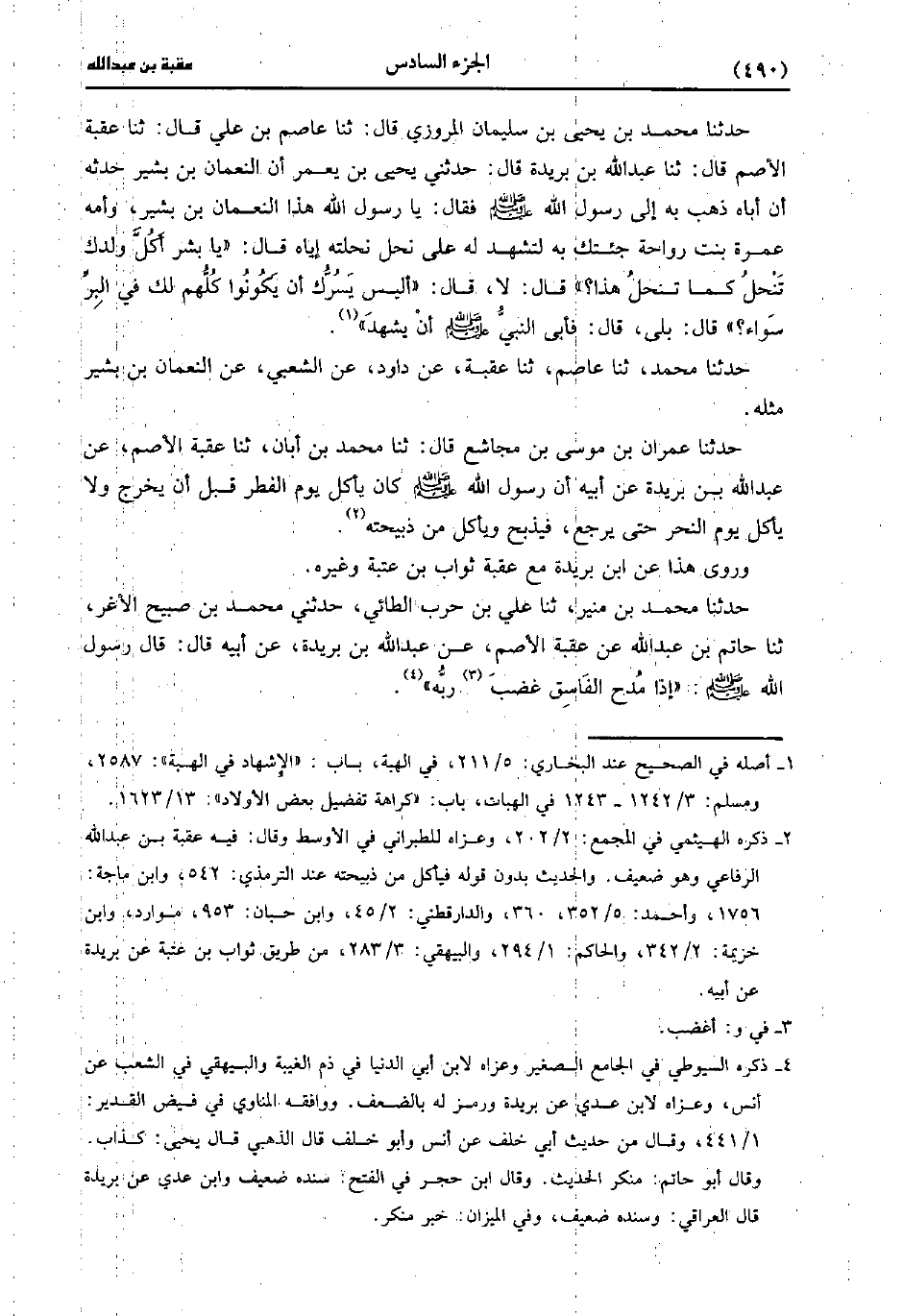 ، حَدَّثَنا مُحَمد بْنُ يَحْيى بْنِ سليمان المرزوي، قَال: حَدَّثَنا عَاصِمُ بْنُ عَلِيٍّ، قَال: حَدَّثَنا عقبة الأصم، قَال: حَدَّثَنا عَبد اللَّهِ بْنُ بُرَيْدَةَ، قَال: حَدَّثني يَحْيَى بْن يَعْمَُرَ أَنَّ النُّعْمَانَ بْنَ بَشِيرٍ حَدَّثَهُ أَنَّ أَبَاهُ ذَهَبَ بِهِ إِلَى رَسُولِ اللَّهِ صَلَّى اللَّهُ عَلَيْهِ وَسَلَّمَ، فَقَالَ، يَا رَسُولَ اللهِ هَذَا النُّعْمَانُ بْنُ بَشِيرٍ وَأُمُّهُ عَمْرَةُ بِنْتُ رَوَاحَةَ جِئْتُكَ بِهِ لِتَشْهَدَ لَهُ عَلَى نُحْلٍ نَحَلْتُهُ إِيَّاهُ قَالَ يَا بِشْرُ أَكُلَّ وَلَدِكَ تَنْحَلُ كَمَا تَنْحَلُ هَذَا؟ قَال: لاَ قَالَ أَلَيْسَ يَسُرُّكَ أَنْ يَكُونُوا كُلُّهُمْ لَكَ فِي الْبِرِّ سَوَاءً قَالَ بَلَى قَالَ فَأَبَى النَّبِيُّ صَلَّى اللَّهُ عَلَيهِ وَسلَّمَ أَنْ يَشْهَدَ.