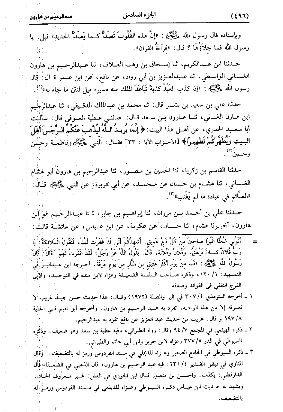 حَدَّثَنَا عَلِيُّ بْنُ سَعِيد بْنِ بَشِيرٍ، قَال: حَدَّثَنا مُحَمد بْنُ عَبد الْمَلِكِ الدَّقِيقِيُّ، حَدَّثَنا عَبد الرَّحِيمِ بْنُ هَارُونَ الْغَسَّانِيُّ، حَدَّثَنا هَارُونُ بْنُ سَعْدٍ، قَال: حَدَّثني عَطِيَّةُ الْعَوْفِيُّ، قالَ: سَألتُ أَبَا سَعِيد الْخُدْرِيَّ عَنْ أَهْلِ هَذَا الْبَيْتِ إِنَّمَا يُرِيدُ اللَّهُ لِيُذْهِبَ عَنْكُمُ الرِّجْسَ أَهْلَ الْبَيْتِ وَيُطَهِّرَكُمْ تطهيرا الآية فَقَالَ النَّبِيُّ صَلَّى اللَّهُ عَلَيهِ وَسلَّمَ وَفَاطِمَةُ وَحَسَنٌ وَحُسَيْنٌ.