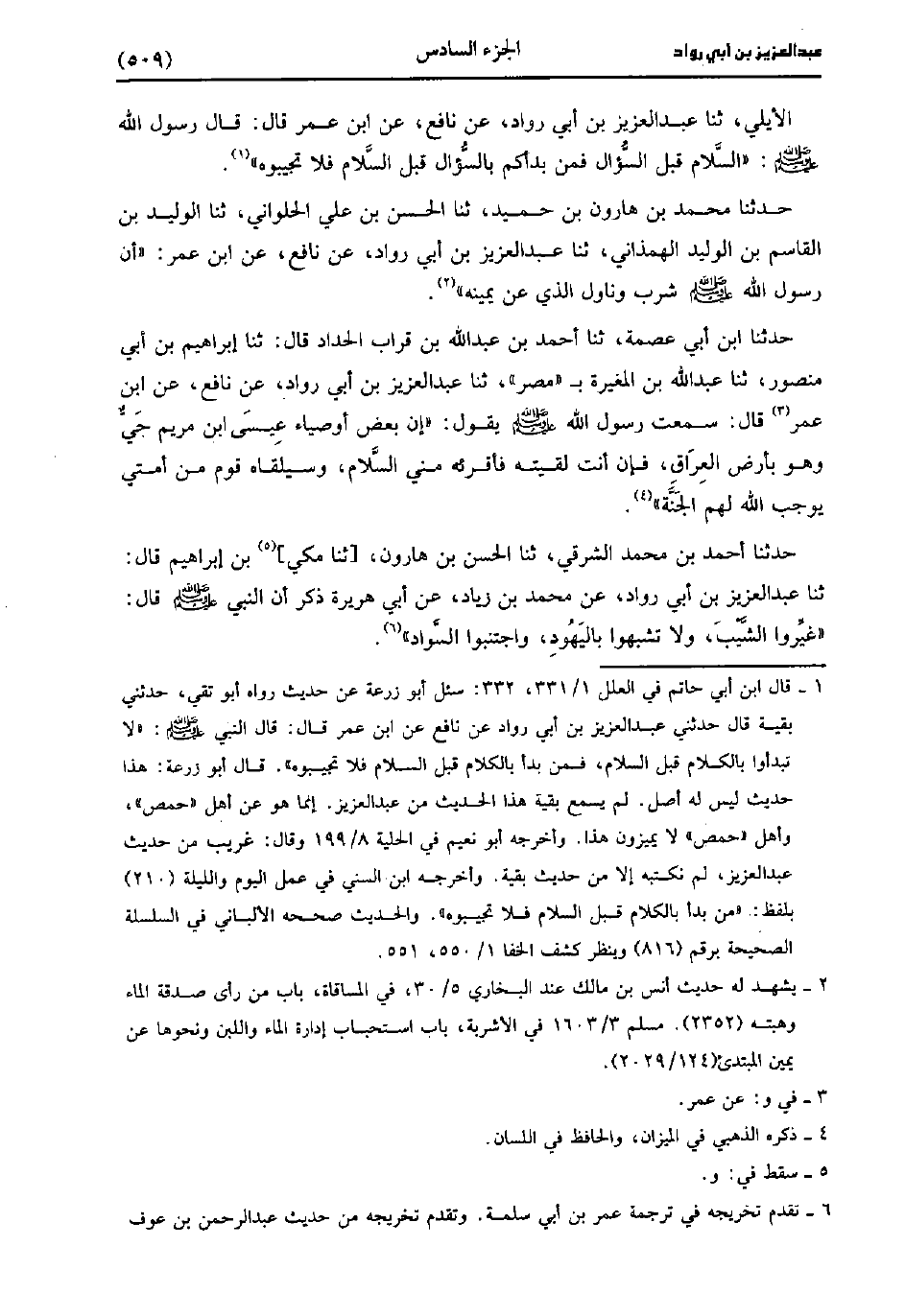 الأيلي، حَدَّثَنا عَبد الْعَزِيزِ بْنِ أَبِي رَوَّاد، عَنْ نَافِعٍ، عنِ ابْنِ عُمَر، قَال: قَال رَسُولُ اللَّهِ صَلَّى اللَّهُ عَلَيْهِ وَسَلَّمَ السَّلامُ قَبْلَ السُّؤَالِ فَمَنْ بَدَأَكُمْ بِالسُّؤَالِ قَبْلَ السَّلامِ فَلا تُجِيبُوهُ.