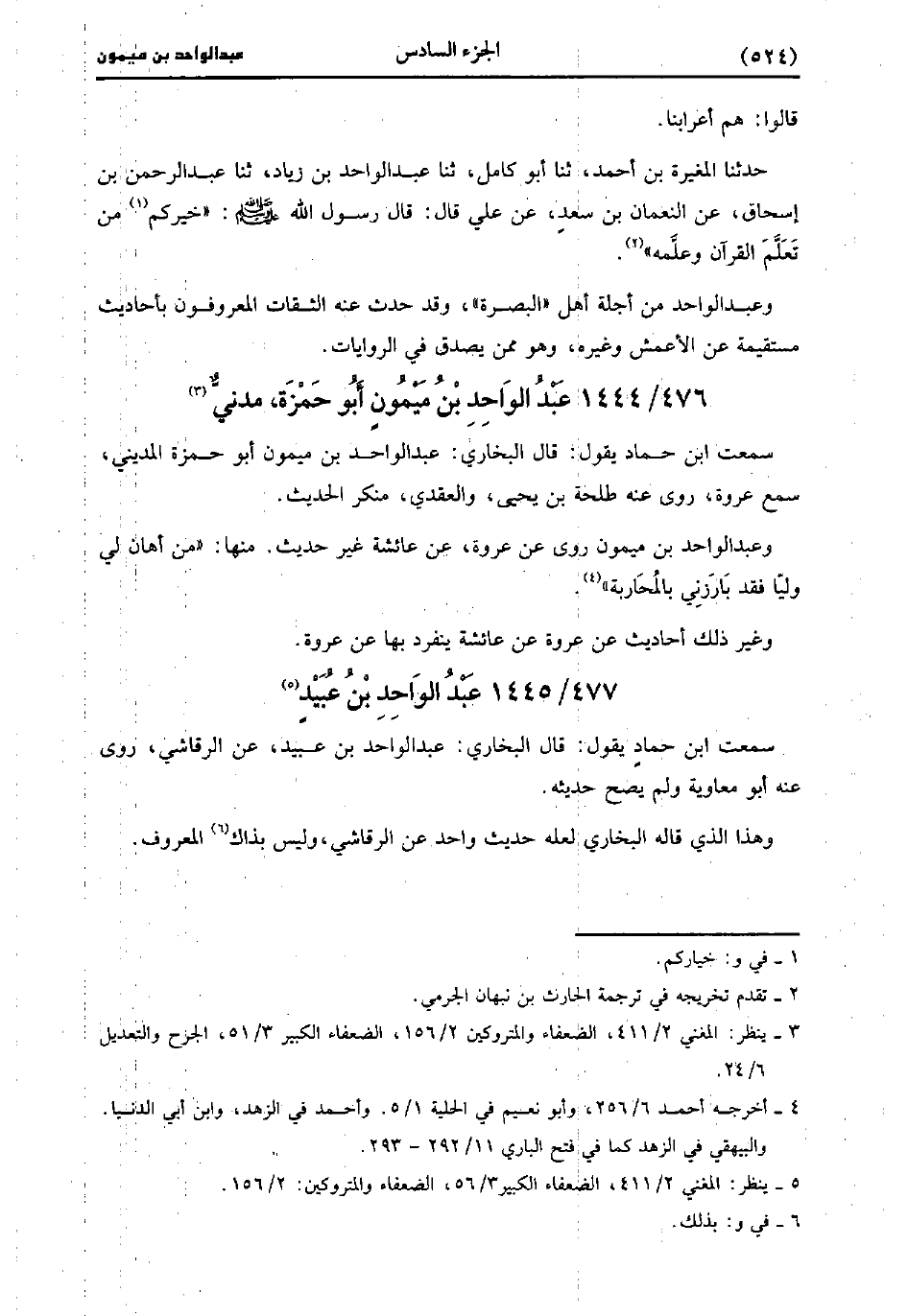 سمعتُ ابن حماد يَقُولُ: قَالَ البُخارِيّ عَبد الواحد بْن ميمون أَبُو حمزة المديني سمع عروة روى عَنْهُ طلحة بْن يَحْيى والعقدي منكر الحديث.