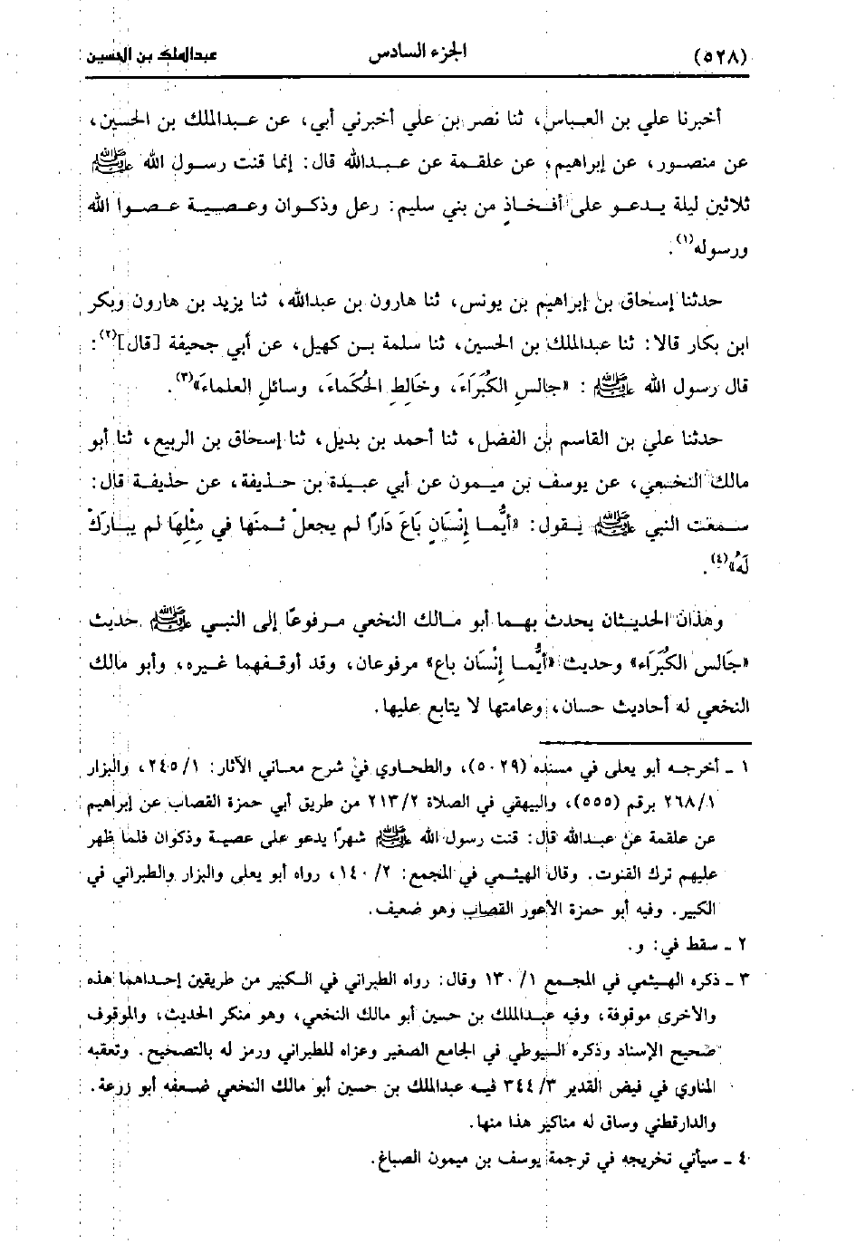 وهذان الحديثان يحدث بهما أَبُو مالك النخعي مرفوعا إِلَى النَّبِيِّ صَلَّى اللَّهُ عَلَيهِ وَسلَّمَ حديث جالس الكبراء وحديث أيما إنسان باع مرفوعان وقد أوقفهما غيره، وأَبُو مالك النخعي لَهُ أحاديث حسان وعامتها، لاَ يُتَابَعُ عَليها
