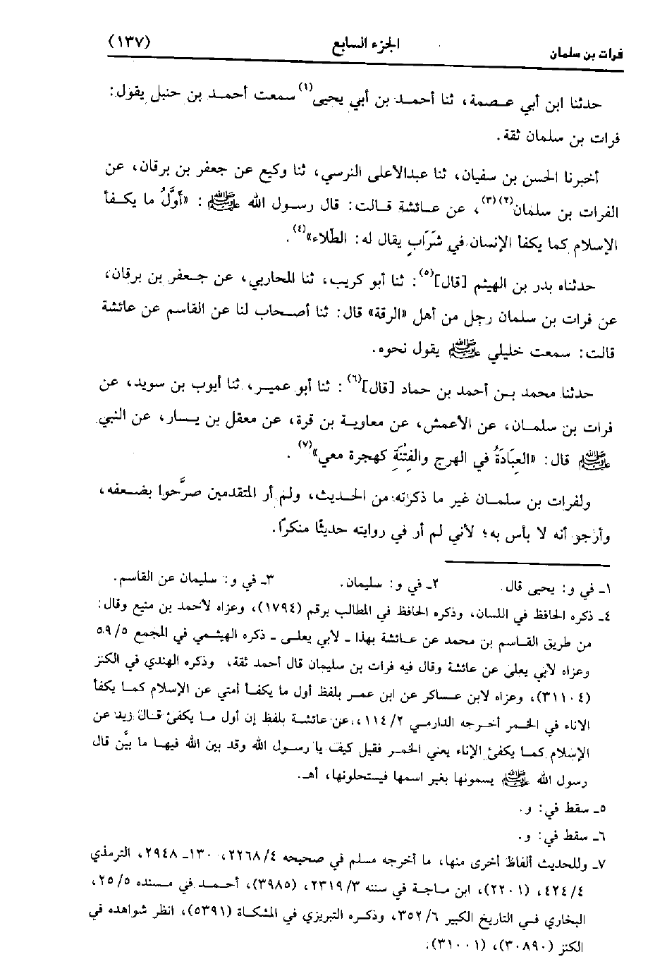 حَدَّثَنَا الحسن بن سفيان، حَدَّثَنا عَبد الأعلى النرسي، حَدَّثَنا وَكِيعٌ عَنْ جَعْفَرِ بْنِ بُرْقَانَ عَنِ الْفُرَاتِ بْنِ سَلْمَانَ عَنْ عَائِشَةَ قَالَتْ قَال رَسُول اللهِ صَلَّى اللَّهُ عَلَيهِ وَسلَّمَ أَوَّلُ مَا يُكْفَأُ الإِسْلامُ كَمَا يُكْفَأُ الإِنَاءُ فِي شَرَابٍ، يُقَال لَهُ: الطِّلاءُ.