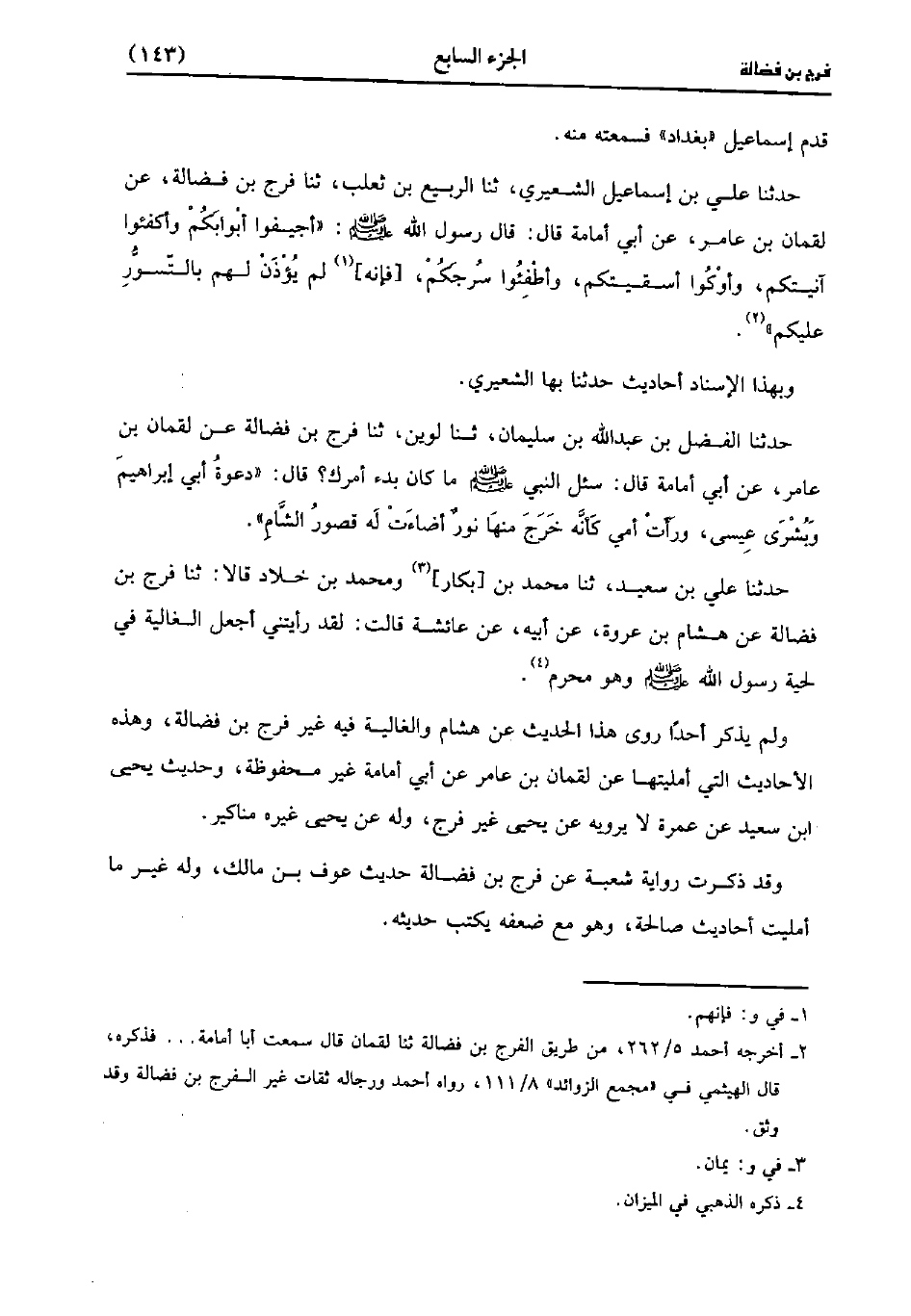 ولم يذكر أحدا روى هذا الحديث عن هشام والغالية فيه غير فرج بن فضالة وَهَذِهِ الأَحَادِيثُ الَّتِي أَمْلَيْتُهَا عَنْ لُقْمَانَ بْنِ عَامِرٍ، عَن أَبِي أمامة غير محفوظة وحديث يَحْيى بن سَعِيد عن عمرة لا يرويه، عَن يَحْيى غير فرج وله، عَن يَحْيى غيره مناكير.
