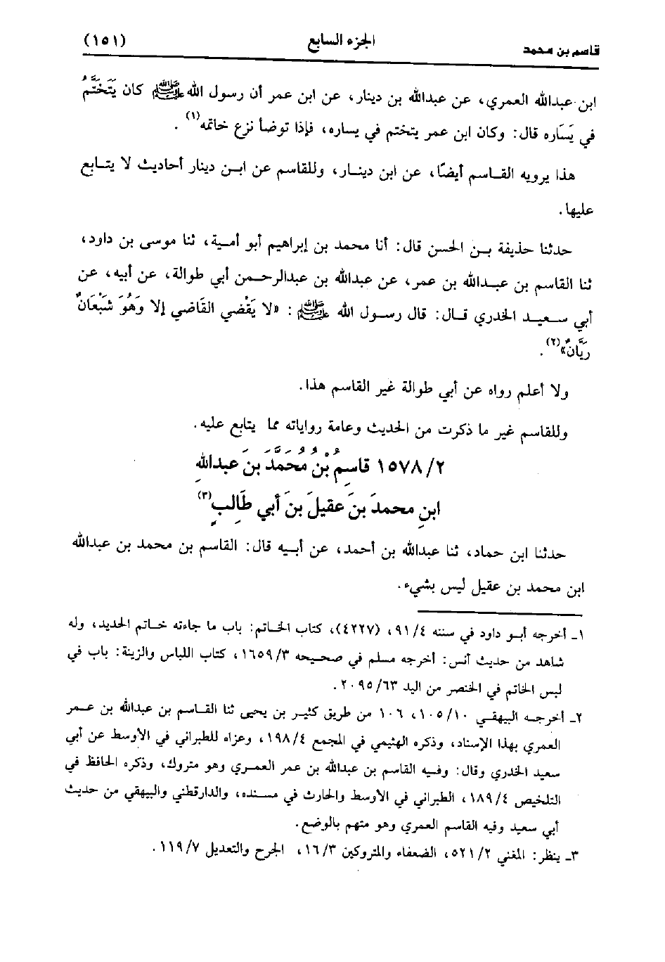 حَدَّثَنَا ابن حماد، حَدَّثَنا عَبد اللَّه بن أحمد، عن أبيه قَالَ القاسم بن مُحَمد بن عَبد اللَّهِ بْنُ مُحَمد بْنِ عَقِيل ليس بشَيْءٍ