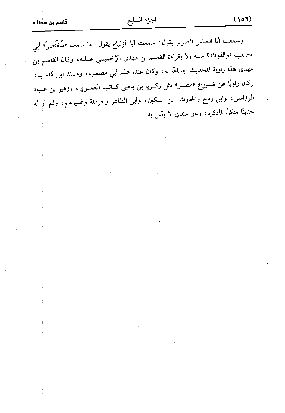 وسمعت أبا العباس الضرير يقول: سَمعتُ أبا الزنباع يقول ما سمعنا مختصر أَبِي مصعب والفوائد مِنْهُ إلاَّ بقراءة القاسم بن مهدي الأخميمي عليه وكان القاسم بن مهدي هذا راوية للحديث جماعا له وكان عنده علم أبي مصعب ومسند أبن كاسب وكان راويا عن شيوخ مصر مثل زكريا بن يَحْيى كاتب العُمَريّ وزهير بن عباد الرؤاسي، وابن رمح والحارث بن مسكين، وأَبُو الطاهر وحرملة وغيرهم ولم أر له حديثا منكرا فأذكره، وَهو عندي لا بأس به