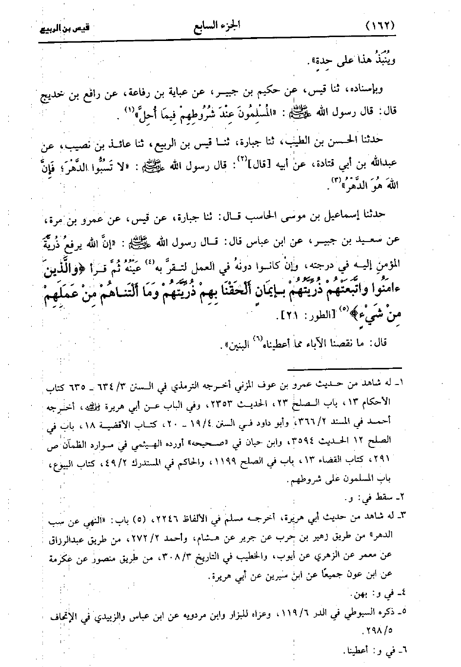 - وَبِإِسْنَادِهِ؛، حَدَّثَنا قَيْسٌ عَنْ حَكِيمِ بْنِ جُبَيْرٍ عَنْ عَبَايَةَ بْنِ رِفَاعَةَ عَنْ رَافِعِ بْنِ خَدِيجٍ، قَال: قَال رَسُولِ اللَّهِ صَلَّى اللَّهُ عَلَيْهِ وَسَلَّمَ الْمُسْلِمُونَ عِنْدَ شُرُوطِهِمْ فِيمَا أُحِلَّ.