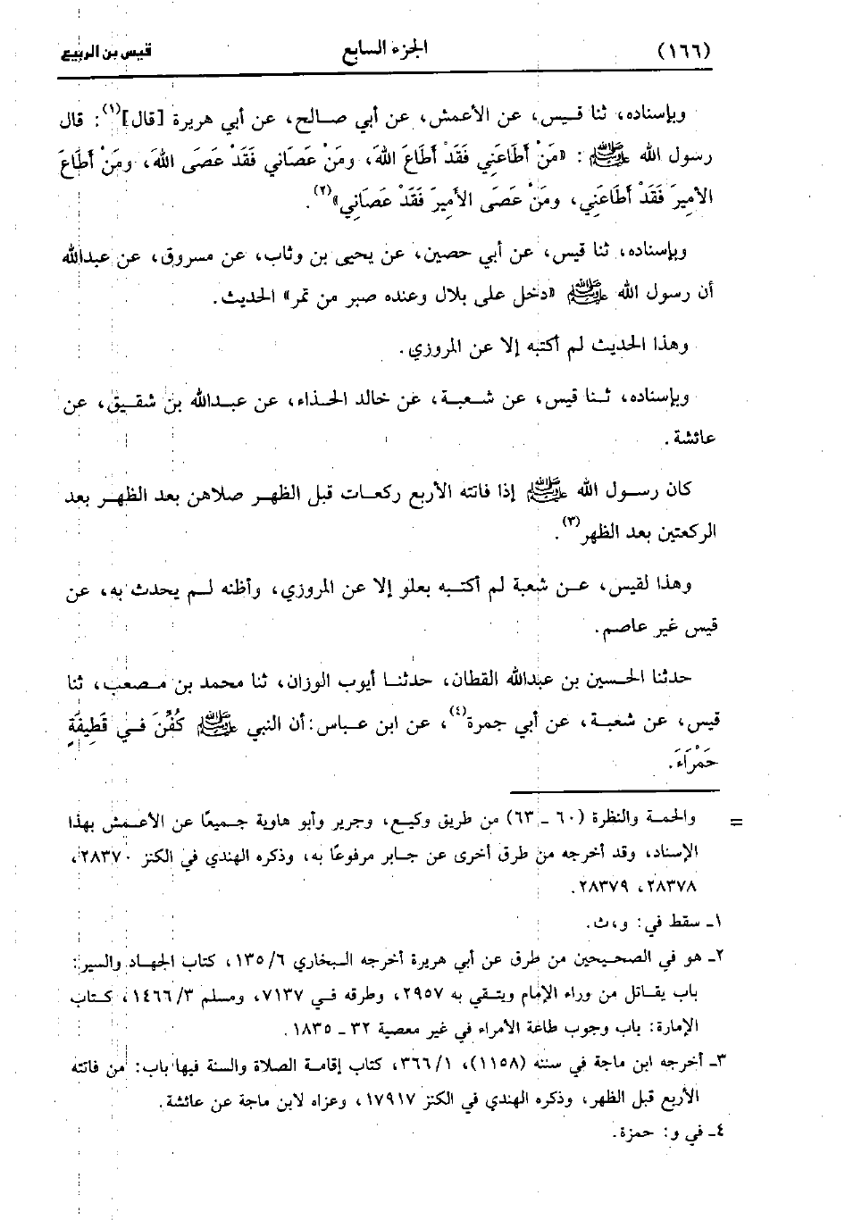 وبإسناده؛، حَدَّثَنا قَيْسٌ، عَنِ الأَعْمَشِ، عَن أَبِي صَالِحٍ، عَن أَبِي هُرَيْرَةَ قَال: قَال رَسُولُ اللَّهِ صَلَّى اللَّهُ عَلَيْهِ وَسَلَّمَ مَنْ أَطَاعَنِي فَقَدْ أَطَاعَ اللَّهَ، ومَنْ عَصَانِي فَقَدْ عَصَى اللَّهَ، ومَنْ أَطَاعَ الأَمِيرَ فَقَدْ أَطَاعَنِي، ومَنْ عَصَى الأَمِيرَ فقد عصاني.
