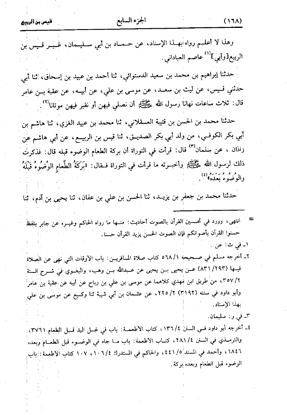 حَدَّثَنَا مُحَمد بْنُ الْحَسَنِ بْنِ قُتَيْبَةَ العسقلاني، حَدَّثَنا مُحَمد بن عُبَيد الغزي، حَدَّثَنا هَاشِمُ بْنُ أَبِي بَكْرٍ الْكُوفِيُّ مِنْ وَلَدِ أَبِي بَكْرٍ الصِّدِّيقِ، حَدَّثَنا قَيْسُ بْنُ الرَّبِيعِ، عَن أَبِي هَاشِمٍ عَنْ زَاذَانَ عَنْ سَلْمَانَ قَالَ قَرَأْتُ فِي التَّوْرَاةِ أَنَّ بَرَكَةَ الطَّعَامِ الْوُضُوءُ قَبْلَهُ قَالَ فَذَكَرْتُ ذَلِكَ لِرَسُولِ اللَّهِ صَلَّى اللَّهُ عَلَيهِ وَسلَّمَ وَأَخْبَرْتُهُ مَا قَرَأْتُ فِي التَّوْرَاةِ فَقَالَ بركة العام الْوُضُوءُ قَبْلَهُ وَالْوُضُوءُ بَعْدَهُ.