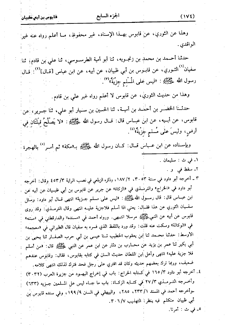حَدَّثَنَا أَحْمَدُ بْنُ مُحَمد بْنِ زَنْجَوَيْهِ، حَدَّثَنا أبو أمية الطرسوسي، حَدَّثَنا علي بن قادم، حَدَّثَنا سُفْيَانُ الثَّوْريّ عَنْ قَابُوسَ بْنِ أَبِي ظَبْيَانَ، عَنْ أَبِيهِ، عنِ ابْنِ عَبَّاسٍ، قَال: قَال رَسُولُ اللَّهِ صَلَّى اللَّهُ عَلَيْهِ وَسَلَّمَ لَيْسَ عَلَى الْمُسْلِمِ جِزْيَةٌ.