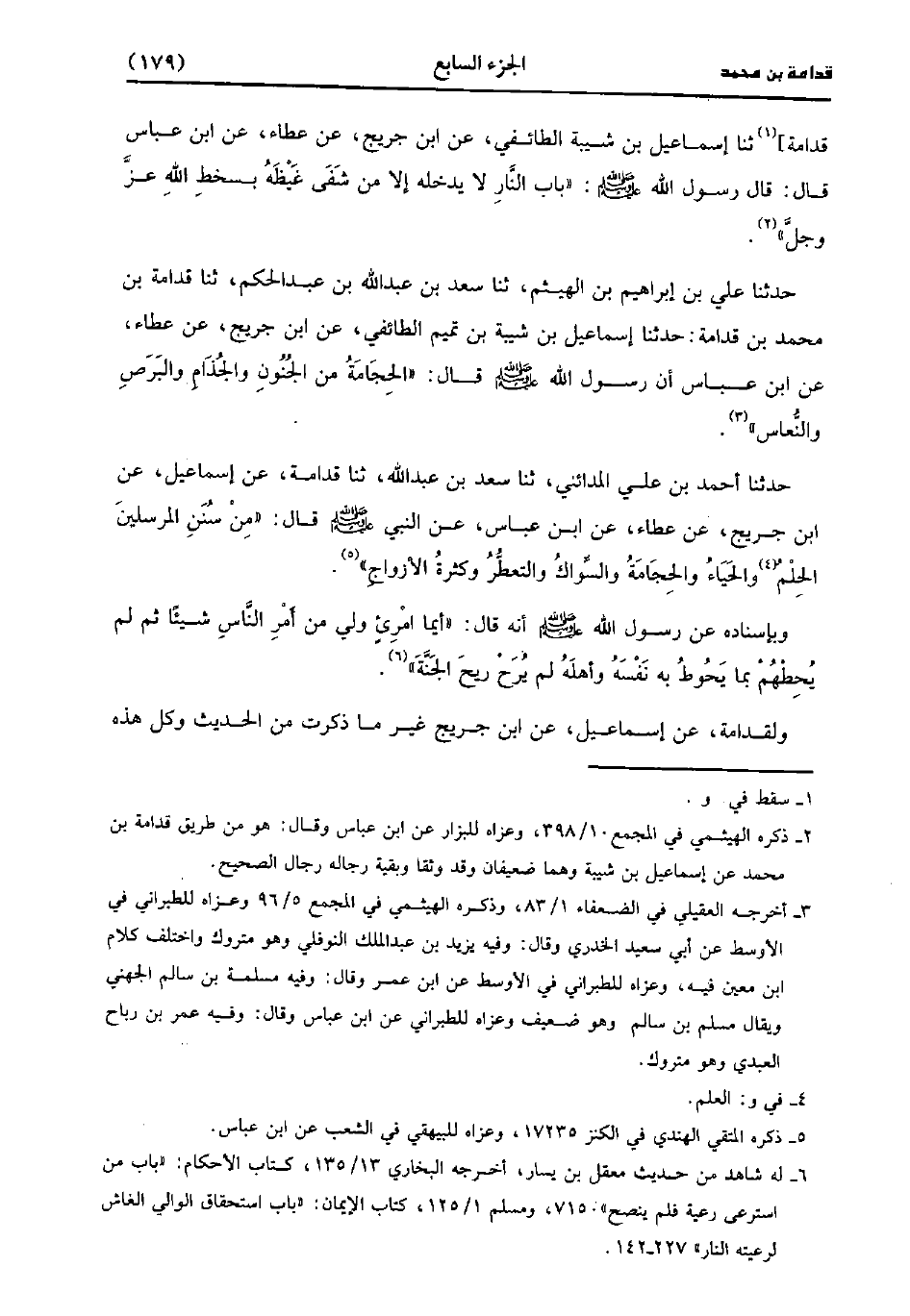 حَدَّثَنَا عَلِيُّ بْنُ إِبْرَاهِيمَ بْنِ الْهَيْثَمِ، حَدَّثَنا سَعْدِ بْنِ عَبد اللَّهِ بْنِ عَبد الحكم، حَدَّثَنا قدامة بن مُحَمد بن قدامة، حَدَّثَنا إِسْمَاعِيلُ بْنُ شَيْبَةَ بْنِ تَمِيمٍ الطَّائِفِيُّ، عنِ ابْنِ جُرَيج، عَن عَطَاءٍ، عنِ ابْنِ عَبَّاسٍ، أَن رسُول اللَّهِ صَلَّى اللَّهُ عَلَيه وسَلَّم قَال: الْحِجَامَةُ مِنَ الْجُنُونِ وَالْجُذَامِ وَالْبَرَصِ وَالنُّعَاسِ.