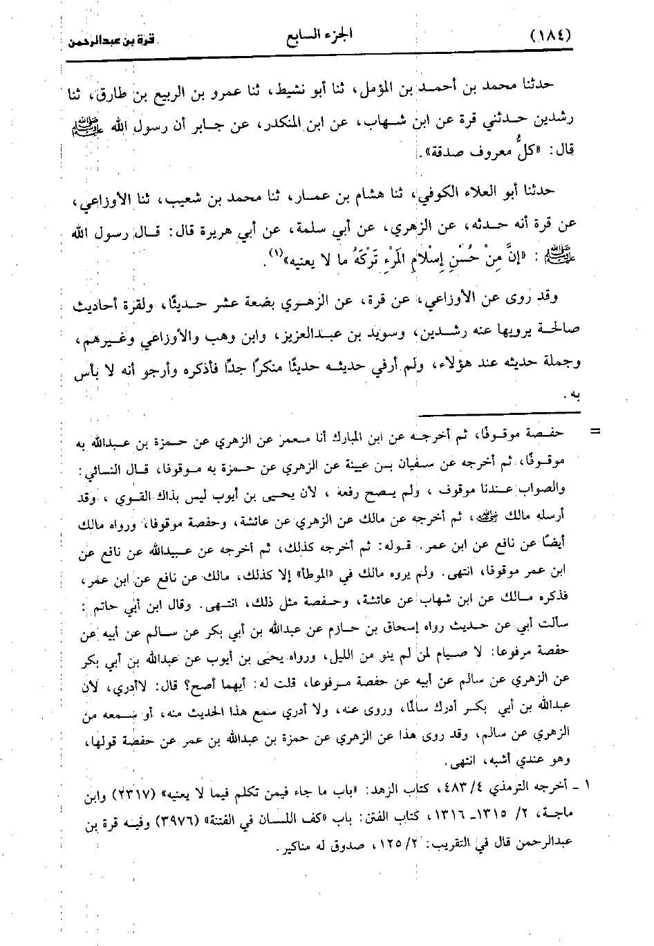 حَدَّثَنَا أَبُو العلاء الكوفي، حَدَّثَنا هِشَامُ بْنُ عَمَّارٍ، حَدَّثَنا مُحَمد بن شُعَيب، حَدَّثَنا الأَوْزاعِيّ عَنْ قُرَّةَ أَنَّهُ حَدَّثَهُ، عنِ الزُّهْريّ، عَن أَبِي سَلَمَةَ، عَن أَبِي هُرَيْرَةَ، قَال: قَال رَسُولِ اللَّهِ صَلَّى اللَّهُ عَلَيْهِ وَسَلَّمَ: إِنَّ مِنْ حُسْنِ إِسْلامِ الْمَرْءِ تَرْكُهُ مَا لا يَعْنِيهِ.