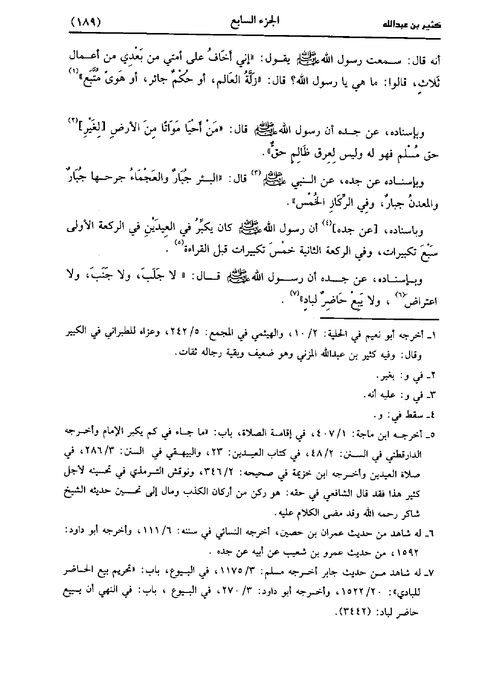 - وَبِإِسْنَادِهِ؛ عَن جَدِّهِ أَنّ رَسُولَ اللَّهِ صَلَّى اللَّهُ عَلَيْهِ وَسَلَّمَ كَانَ يُكَبِّرُ فِي الْعِيدَيْنِ فِي الرَّكْعَةِ الأُولَى سَبْعَ تَكْبِيرَاتٍ وَفِي الرَّكْعَةِ الثَّانِيَةِ خَمْسَ تَكْبِيرَاتٍ قَبْلَ الْقِرَاءَةِ.