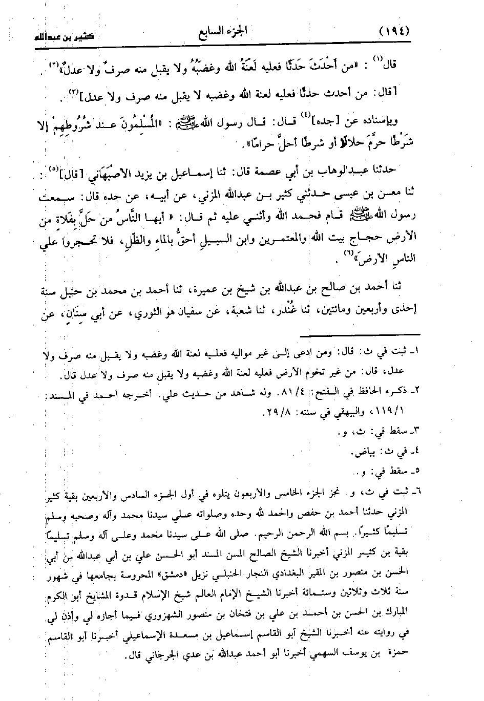 حَدَّثَنَا عَبد الْوَهَّابِ بْنُ أبي عصمة، قَال: حَدَّثَنا إِسْمَاعِيلُ بْنُ يَزِيدَ الأَصْبَهَانِيُّ، قَال: حَدَّثَنا مَعْنُ بْنُ عِيسَى، حَدَّثني كَثِيرُ بْنِ عَبد اللَّهِ الْمُزَنِيِّ، عَنْ أَبِيهِ، عَن جَدِّهِ، قَالَ: سَمِعْتُ رَسُولِ اللَّهِ صَلَّى اللَّهُ عَلَيْهِ وَسَلَّمَ قَامَ فَحَمِدَ اللَّهَ وَأَثْنَي عَلَيْهِ ثُمَّ قَالَ أَيُّهَا النَّاسُ مَنْ حَلَّ بِفَلاةٍ مِنَ الأَرْضِ حُجَّاج بَيْتِ اللَّهِ وَالْمُعْتَمِرِينَ، وَابْن السَّبِيلِ أَحَقُّ بِالْمَاءِ وَالظِّلِّ فَلا تحجروا على الناس الأرض.