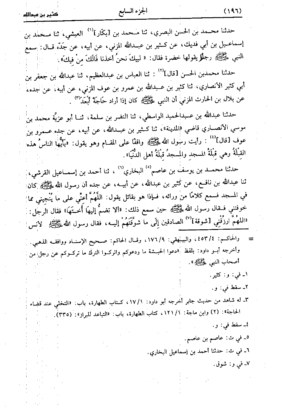 حَدَّثَنَا مُحَمد بْنُ يُوسُفَ بن عاصم البُخارِيّ، حَدَّثَنا أحمد بن إسماعيل القرشي، حَدَّثَنا عَبد اللَّه بن نافع عَنْ كَثِيرِ بْنِ عَبد اللَّهِ، عَنْ أَبِيهِ، عَن جَدِّهِ أَنَّ رَسُولِ اللَّهِ صَلَّى اللَّهُ عَلَيْهِ وَسَلَّمَ كَانَ فِي الْمَسْجِدِ فَسَمِعَ كَلامًا مِنْ وَرَائِهِ فَإِذَا هُوَ بِقَائِلٍ يَقُولُ اللَّهُمَّ أَعِنِّي عَلَى مَا يُنْجِينِي مِمَّا خَوَّفْتَنِي فَقَالَ رَسُولِ اللَّهِ صَلَّى اللَّهُ عَلَيْهِ وَسَلَّمَ حِينَ سَمِعَ ذَلِكَ أَلا تَضُمُّ إِلَيْهَا أُخْتَهَا فَقَالَ الرَّجُلُ اللَّهُمَّ ارْزُقْنِي شَوْقَةَ الصَّادِقِينَ إِلَى مَا شَوَّقْتَهُمْ إِلَيْهِ فَقَالَ رَسُولُ اللَّهِ صَلَّى اللَّهُ عَلَيْهِ وَسَلَّمَ لأنس