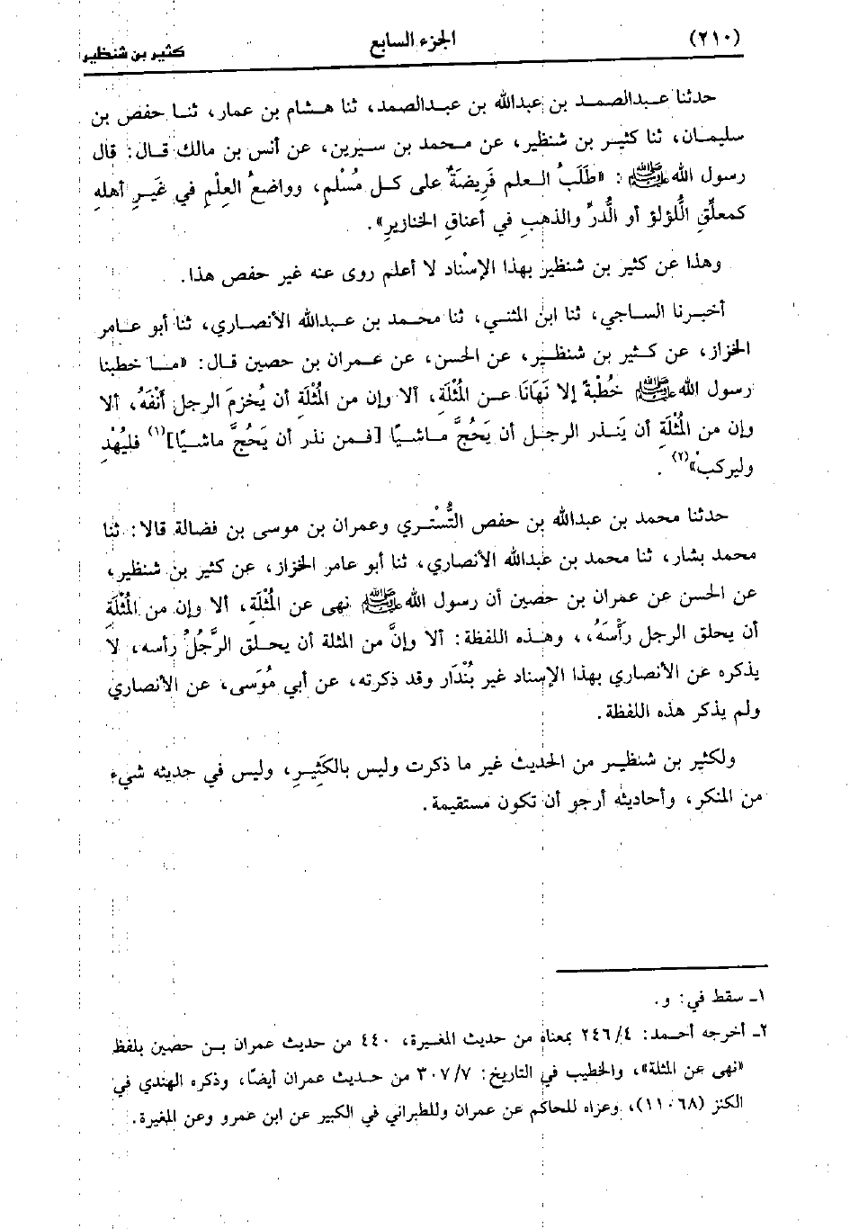 ، حَدَّثَنا عَبد الصَّمَدِ بْنُ عَبد الله بن عَبد الصمد، حَدَّثَنا هِشَامُ بْنُ عَمَّارٍ، حَدَّثَنا حفص بن سليمان، حَدَّثَنا كَثِيرُ بْنُ شَنْظِيرَ عَنْ مُحَمد بْنُ سِيرِين، عَن أَنَس بْنِ مَالِكٍ، قَال: قَال رَسُولُ اللَّهِ صَلَّى اللَّهُ عَلَيْهِ وَسَلَّمَ طَلَبُ الْعِلْمِ فَرِيضَةٌ عَلَى كُلِّ مُسْلِمٍ وَوَاضِعُ الْعِلْمِ فِي غَيْرِ أَهْلِهِ كَمُعَلِّقِ اللُّؤْلُؤِ أَوِ الدُّرِّ وَالذَّهَبِ فِي أَعْنَاقِ الْخَنَازِيرِ.