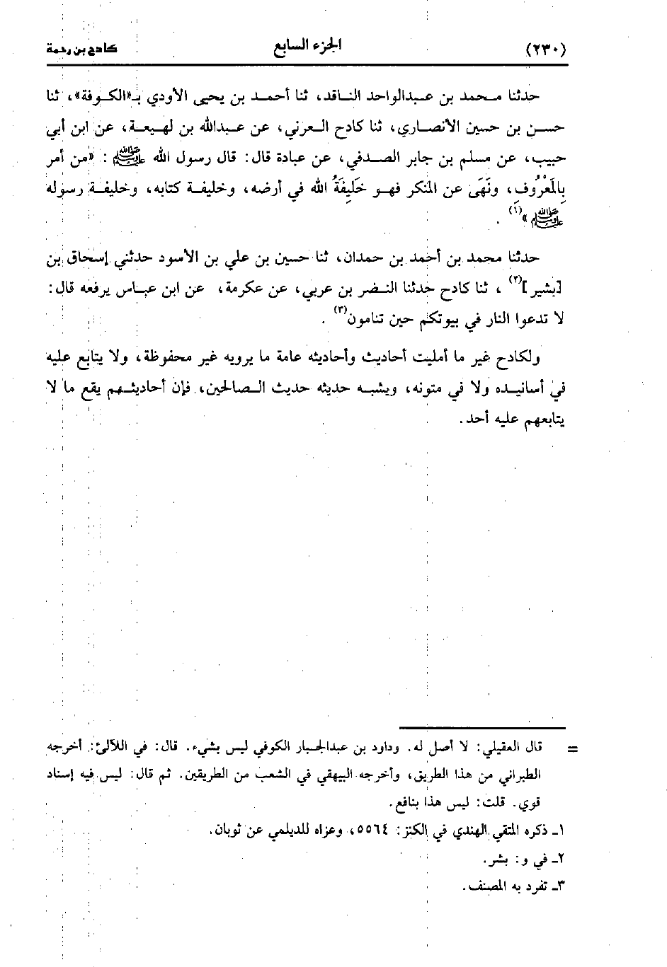 ، حَدَّثَنا مُحَمد بْنُ عَبد الْوَاحِدِ الناقد، حَدَّثَنا أحمد بن يَحْيى الأودي بالكوفة، حَدَّثَنا حسن بن حسين الأنصاري، حَدَّثَنا كَادِحٌ الْعُرَنِيُّ عَنْ عَبد اللَّهِ بْنِ لَهِيعَة، عنِ ابْنِ أَبِي حَبِيبٍ عَنْ مُسْلِمِ بْنِ جَابِرٍ الصَّدَفِيِّ عَنْ عُبَادَةَ، قَال: قَال رَسُولِ اللَّهِ صَلَّى اللَّهُ عَلَيْهِ وَسَلَّمَ مَنْ أَمَرَ بِالْمَعْرُوفِ وَنَهَى عَنِ الْمُنْكَرِ فَهُوَ خَلِيفَةُ اللَّهِ فِي أَرْضِهِ وَخَلِيفَةُ كِتَابِهِ وَخَلِيفَةُ رَسُولِهِ صَلَّى اللَّهُ عَلَيهِ وَسلَّمَ.