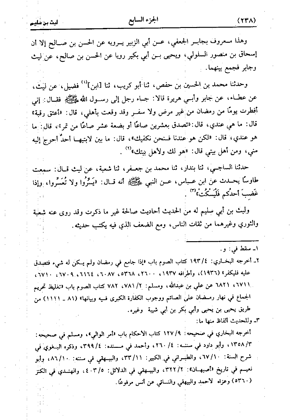 وهذا معروف بجابر الجعفي، عَن أَبِي الزبير عن الحسن بن صالح إلا أن إسحاق بن منصور السلولي ويحيى بن أَبِي بُكَير رويا عن الحسن بن صالح، عن ليث وجابر فجمع بينهما (ح) وَحَدَّثَنَا مُحَمد بْنُ الْحُسَيْنِ بْنِ حَفْصٍ، حَدَّثَنا أَبُو كُرَيْبٍ، حَدَّثَنا ابْنُ فَضْلٍ عَنْ لَيْثٍ عَنْ عَطاء، عَن جَابِرٍ وَأَبِي هُرَيْرَةَ قَالا جَاءَ رَجُلٌ إِلَى رَسُولِ اللَّهِ صَلَّى اللَّهُ عَلَيْهِ وَسَلَّمَ فَقَالَ إِنِّي أَفْطَرْتُ يَوْمًا فِي رَمَضَانَ مِنْ غَيْرِ مَرَضٍ، ولاَ سَفَرٍ وَقَدْ وَقَعْتُ بِأَهْلِي قَالَ أَعْتِقْ رَقَبَةً قَال: مَا هِيَ عِنْدِي قَالَ تَصَدَّقْ بِعِشْرِينَ صَاعًا أَوْ بِضْعَةَ عَشْرَ صَاعًا مِنْ تَمْرٍ قَال: مَا هُوَ عِنْدِي قَالَ لَكِنْ هُوَ عِنْدَنَا فَنَحْنُ نَكْفِيكَ قَال: مَا بَيْنَ لابَتَيْهَا أَحَدٌ أَحْوَجُ إِلَيْهِ مِنِّي وَمِنْ أَهْلِ بَيْتِي قَالَ هُوَ لَكَ ولأهل بيتك.