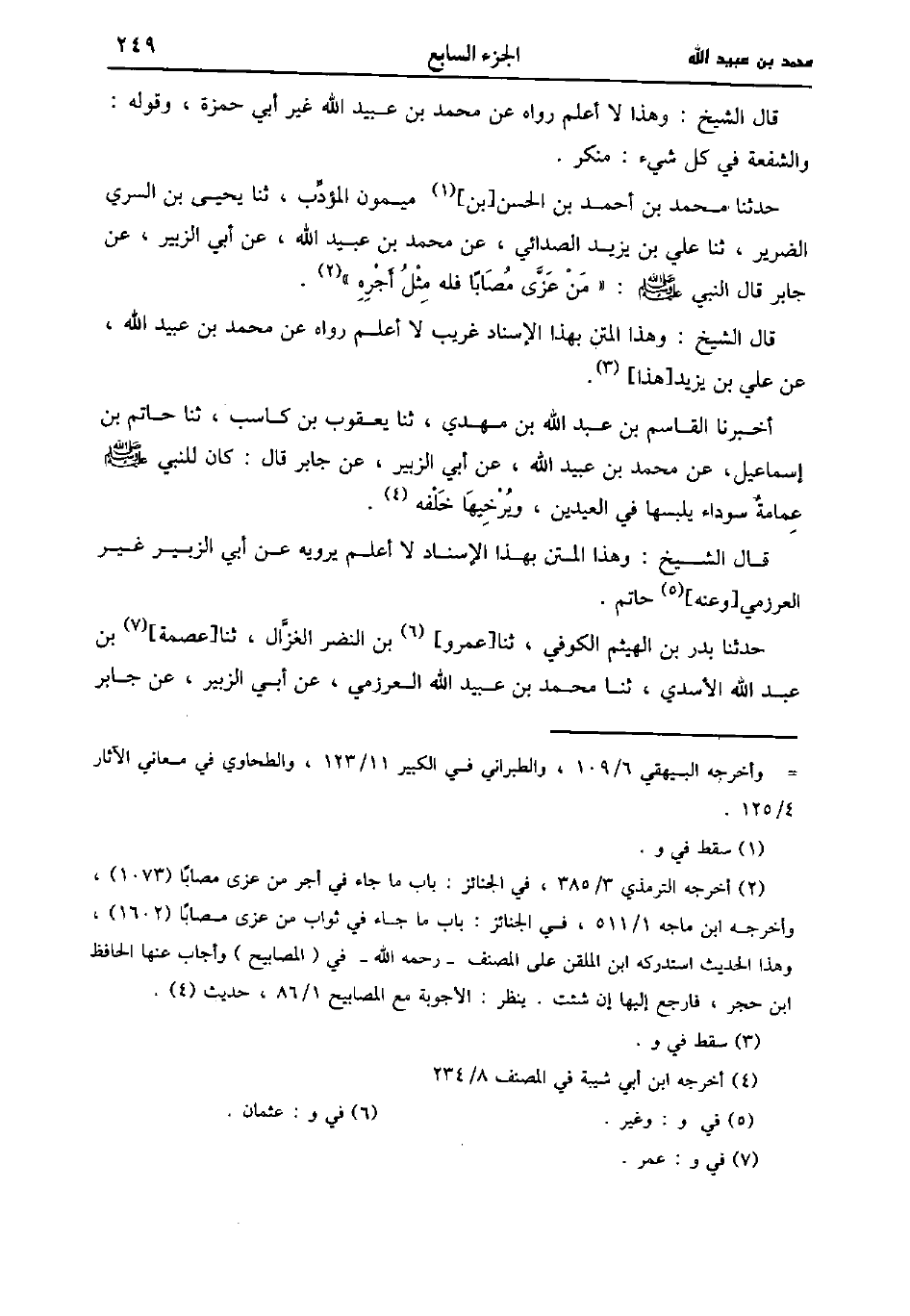 حَدَّثَنَا أَحْمَدُ بْنُ أَبِي أَحْمَدَ بْنِ الْحَسَنِ بْنِ مَيْمُونَ الْمُؤَدِّبُ، حَدَّثَنا يَحْيى بن السري الضرير، حَدَّثَنا عَلِيُّ بْنُ يَزِيدَ الصُّدَائِيُّ عَنِ مُحَمد بْنُ عُبَيد اللَّهِ، عَن أَبِي الزُّبَيْرِ عَنْ جَابِرٍ قَالَ النَّبِيُّ صَلَّى اللَّهُ عَلَيهِ وَسلَّمَ مَنْ عَزَّى مُصَابًا فَلَهُ مِثْلُ أَجْرِهِ.