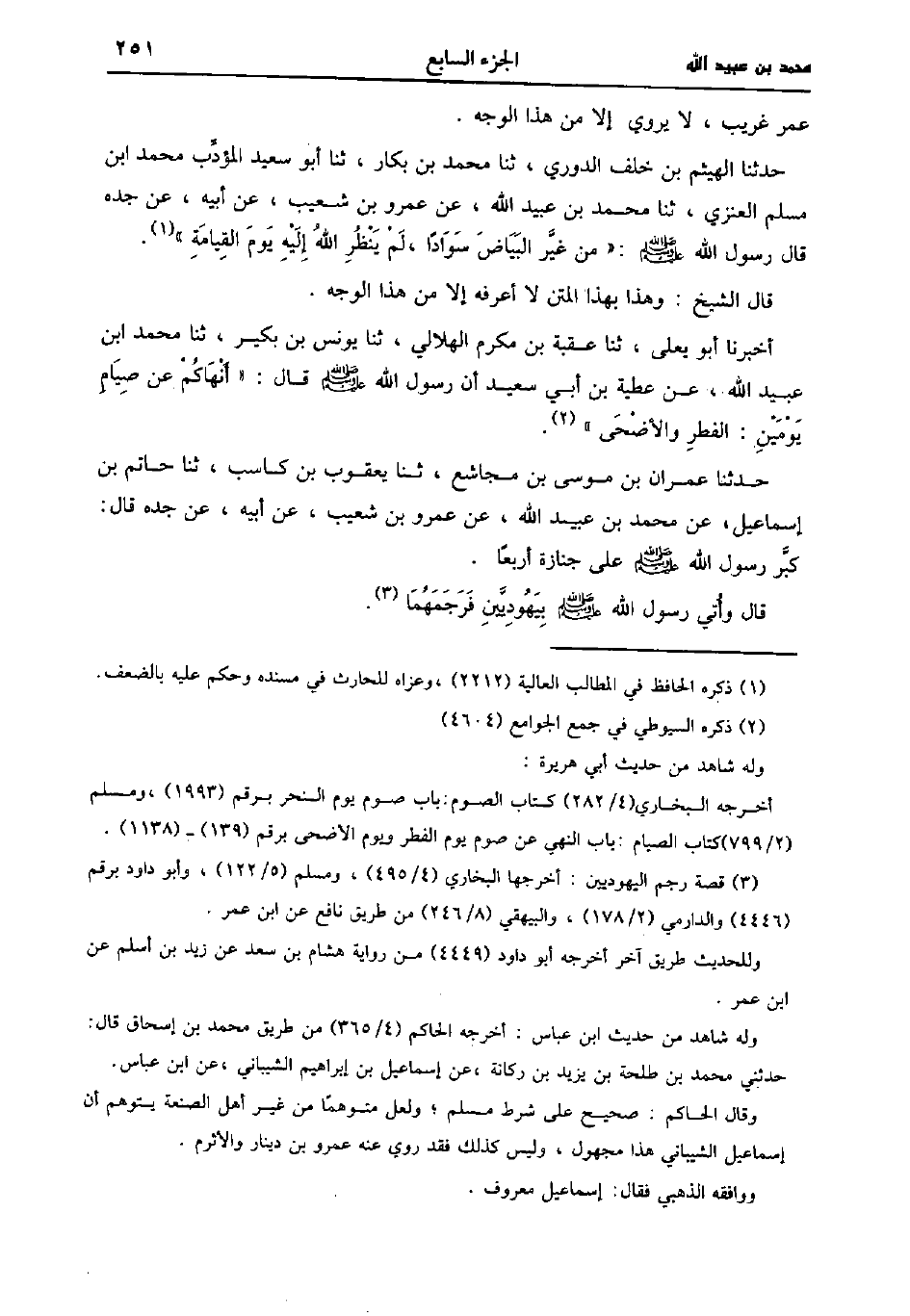 حَدَّثَنَا أبو يعلى، حَدَّثَنا عقبة بن مكرم الهلالي، حَدَّثَنا يُونُس بن بُكَير، حَدَّثَنا مُحَمد بن عُبَيد اللهعن عَطِيَّةَ بْنِ أَبِي سَعِيد أَنَّ رَسُولِ اللَّهِ صَلَّى اللَّهُ عَلَيْهِ وَسَلَّمَ صَلَّى اللَّهُ عَلَيه وسَلَّم قَال: أَنْهَاكُمْ عَنْ صِيَامِ يَوْمَيْنِ الْفِطْرِ وَالأَضْحَى.