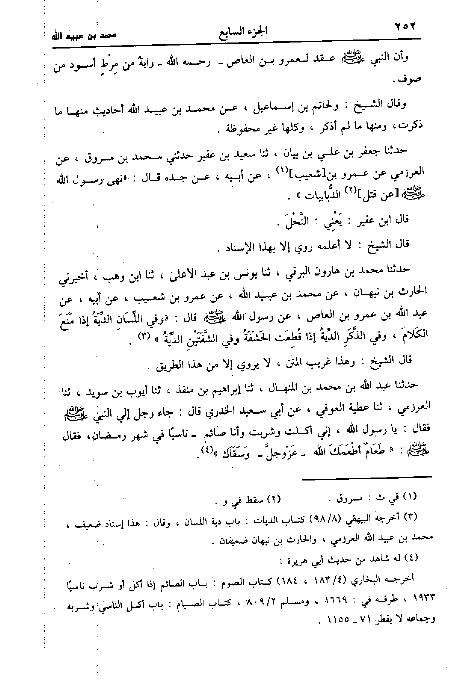 حَدَّثَنَا عَبد اللَّهِ بْنُ مُحَمد بن المنهال، حَدَّثَنا إبراهيم بن منقذ، حَدَّثَنا أَيُّوبُ بْنُ سُوَيْدٍ، حَدَّثَنا العرزمي، حَدَّثَنا عَطِيَّةَ الْعَوْفِيِّ، عَن أَبِي سَعِيد الْخُدْرِيِّ قَالَ: جَاء رَجُلٌ إِلَى النَّبِيُّ صَلَّى اللَّهُ عَلَيهِ وَسلَّمَ، فَقَالَ، يَا رَسُولَ اللهِ إِنِّي أَكَلْتُ وَشَرِبْتُ وَأَنَا صَائِمٌ نَاسِيًا فِي شَهْرِ رَمَضَانَ فَقَالَ رَسُولُ اللَّهِ صَلَّى اللَّهُ عَلَيْهِ وَسَلَّمَ طَعَامٌ أَطْعَمَكَ اللَّهُ عَزَّ وَجَلَّ وسقاك