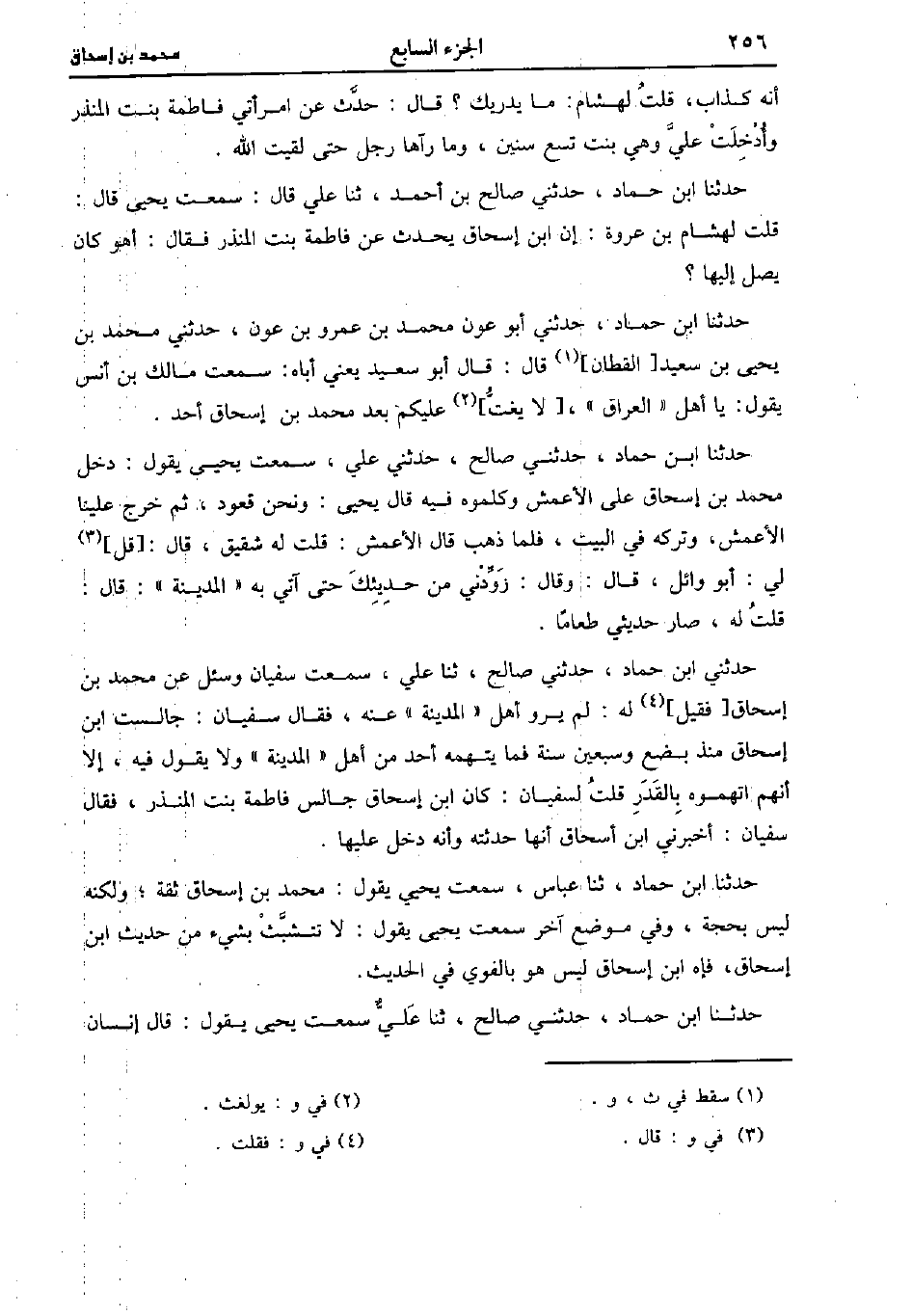 حَدَّثني ابن حماد، حَدَّثني صَالِح، حَدَّثَنا عَلِيّ سَمِعْتُ سفيان وَسُئِل عن مُحَمد بن إسحاق فقيل له لم يرو أهل المدينة عنه فقال سفيان جالست بن إسحاق منذ بضع وسبعين سنة فما يتهمه أحد من أهل المدينة، ولاَ يقول فيه إلاَّ أنهم اتهموه بالقدر قلت لسفيان كَانَ ابن إسحاق جالس فاطمة بنت المنذر فقال سفيان أخبرني بن إسحاق أنها حدثته وأنه دخل عليه.