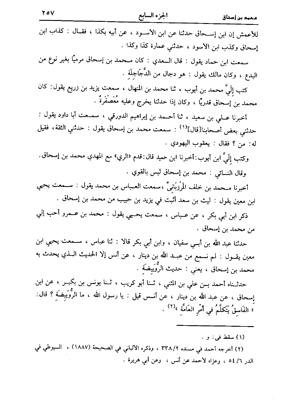 كتب إِلَى مُحَمد بن أيوب، حَدَّثَنا مُحَمد بن المنهال سمعت يزيد بن زريع يقول كَانَ مُحَمد بن إسحاق قدريا وكان إذا، حَدَّثَنا يخرج وعليه معصفرة.